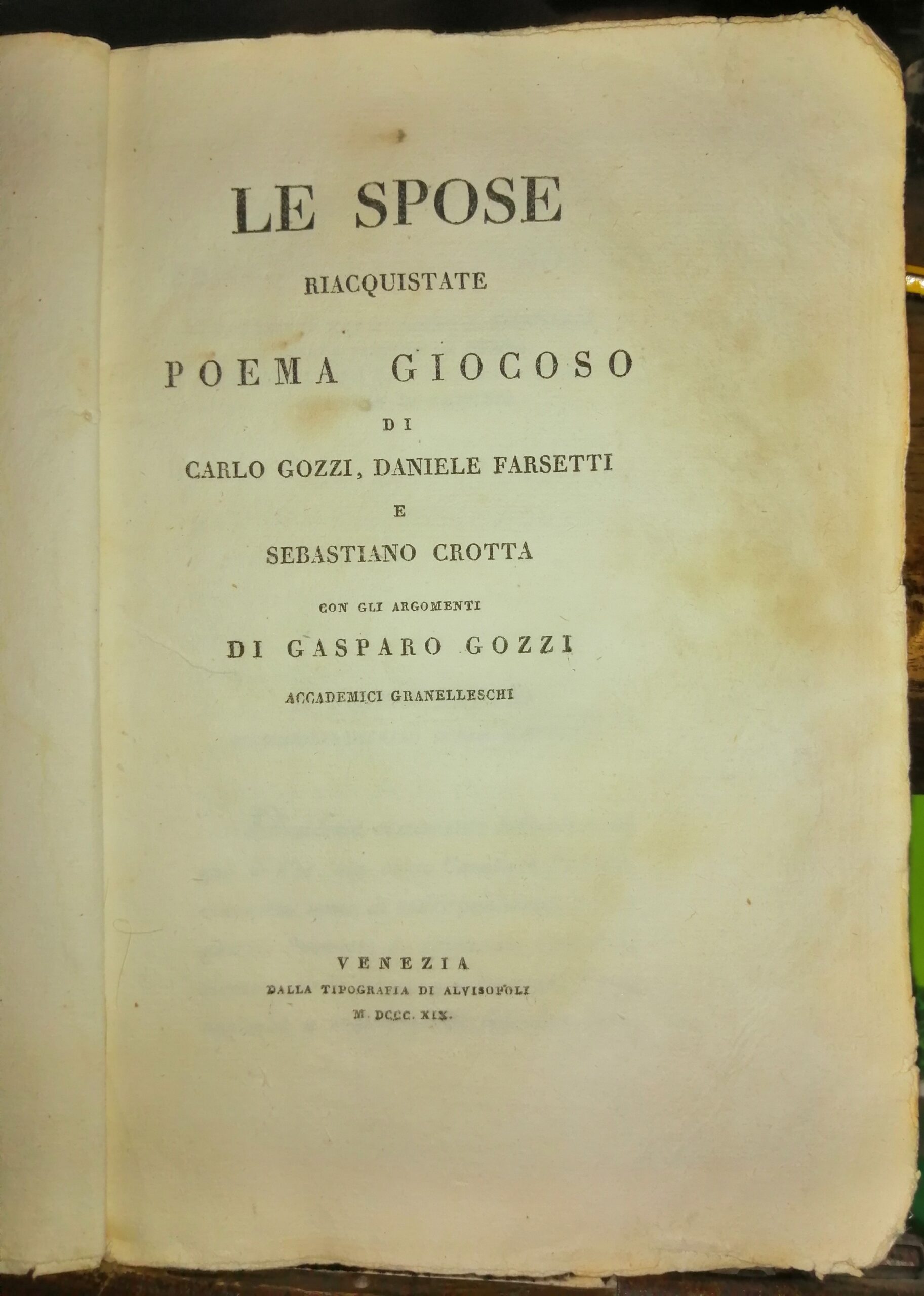 In-8 (20 cm) XXIII (1) 232. Brossura editoriale. Parzialmente intonso, in barbe; carta vergatina settecentesca. Piatti usurati agli angoli; gora insistente alle ultime carte. Prima edizione. Carlo Gozzi (1720-1806). Nato a Venezia nel 1720 da famiglia nobile, ma in gravi difficoltà economiche. Carlo si rifiutò sempre, per orgoglio aristocratico, di ricavare guadagni dalla sua attività di letterato. Nel 1747 fu con il fratello Gasparo tra i fondatori dell’Accademia dei Granelleschi di Venezia, una delle istituzioni più conservatrici del XVIII secolo italico. In polemica con Goldoni e con Chiari, colpevoli di aver messo in scena argomenti troppo realistici e plebei, pubblicò alcuni scritti satirici, come “La tartana degli influssi per l’anno 1756” (1757). Nel 1761- 1765 fece rappresentare con successo dalla compagnia del ‘Truffaldino’ Antonio Sacchi dieci Favole teatrali che riprendevano schemi e maschere della commedia dell’arte. In tutta l’opera di Carlo Gozzi costante è l’acre, pungente e puntigliosa polemica contro i princìpi illuministici. Raggiunge apprezzabili esiti solo quando, allentata la tensione, la polemica si risolve in invenzioni umoristiche e fantastiche. Morì a Venezia nel 1806. L’argomento di questo “giocoso poemetto” fu tratto da un’avvenimento del secolo decimo che gli “Istorici veneziani” riportano come accaduto tra il 920 e il 944, sebbene non siano concordi tra loro sull’anno preciso;…in quel “tempo in cui si vuole che in Venezia le donzelle promesse a marito si portassero annualmente alla Chiesa di S. Pietro in Castello col corredo ognuna della propria dota, per effettuare coi sacri riti il loro matrionio. Di tale costume istruiti li Corsari triestini macchinarono di rapire insieme colle Spose le dote,…, cogliendo all’impensata le Spose mentre li veneziani disarmati impedir non poteano così perversa soperchieria.