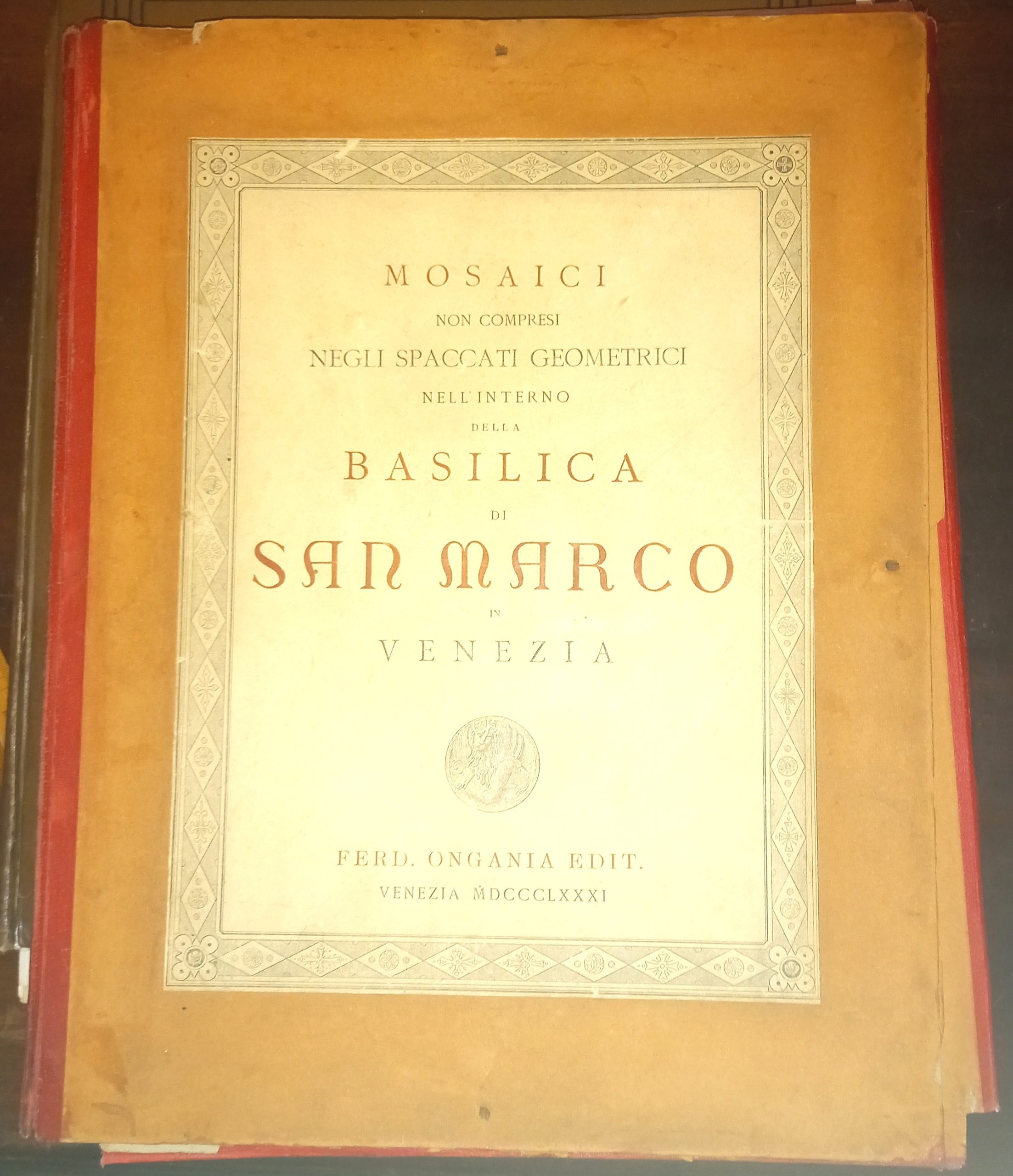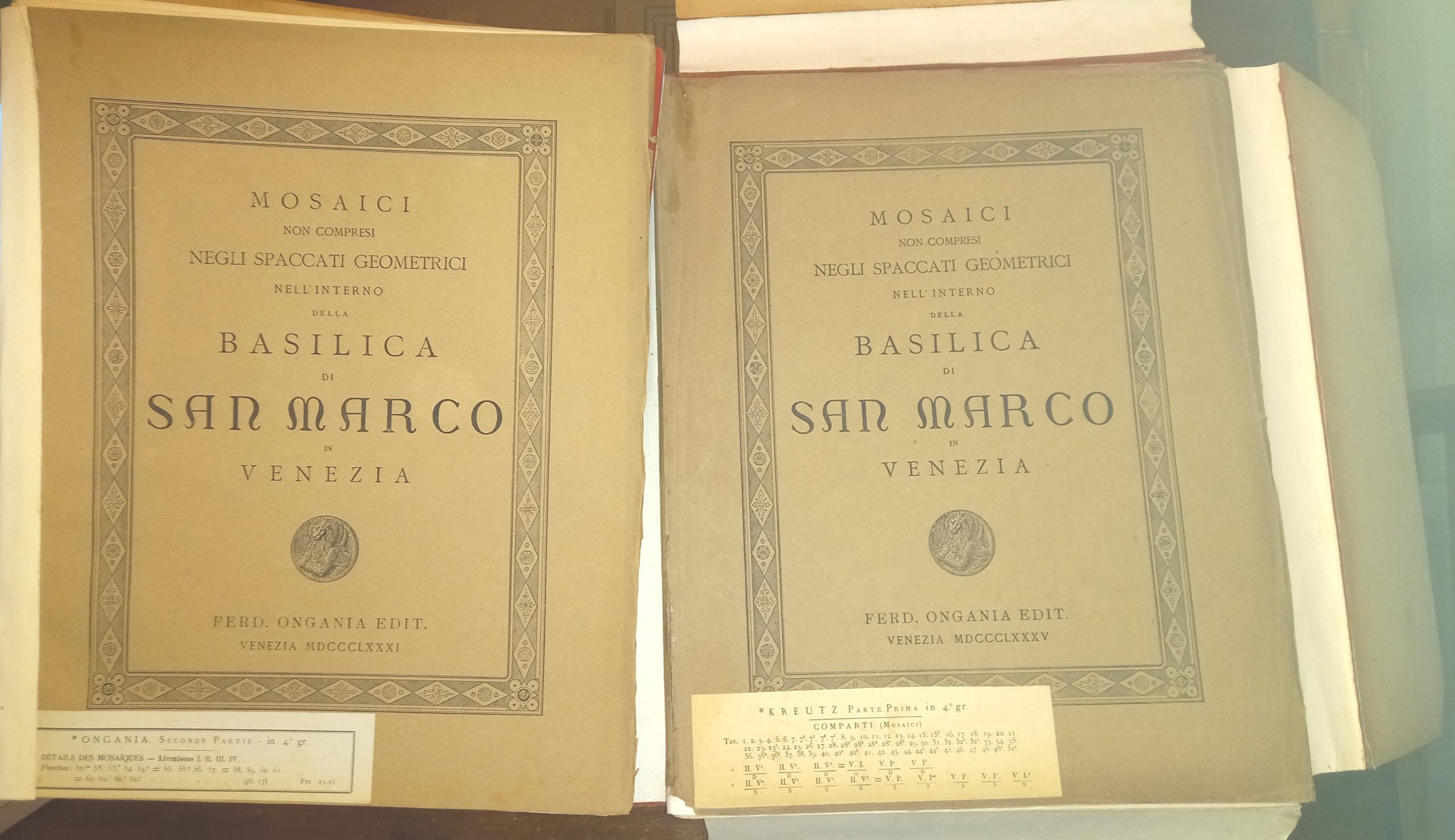 In-folio 2 cartelle contenenti 128 tavole incise relative a mosaici e dettagli non compresi nel Portafoglio 1. Sono assenti i due fogli contrassegnati con “K” e “V.I.b-D). L’opera fa parte della colossale impresa editoriale di Ongania sulla Basilica.
