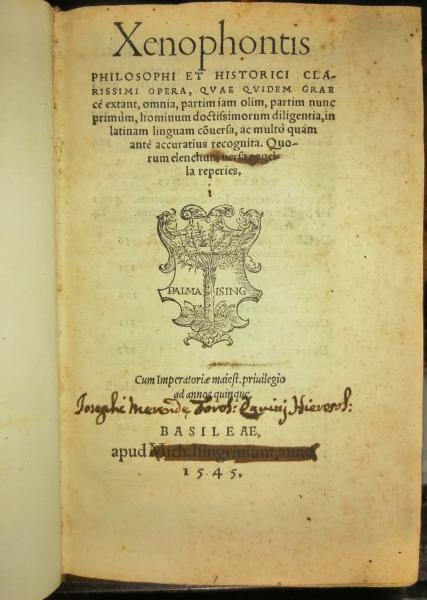 In-8 (17 cm)(20) 820 (4) 421(1).Mezza pergamena, con piatti rivestiti di carta marmorizzata. Sul verso del frontespizio sono indicati i nomi dei traduttori e dei prefatori: Filelfo, Amaseo, Pirckheimer, Bessarione, Leonardo Bruni, Ognibene da Lonigo, Volterrano e Cameraio.La seconda parte ha come titolo “Xenophontis de Republica et legibus lacedaemoniorum liber” Francisco Philepho interprete. Numerose glosse nel testo.
