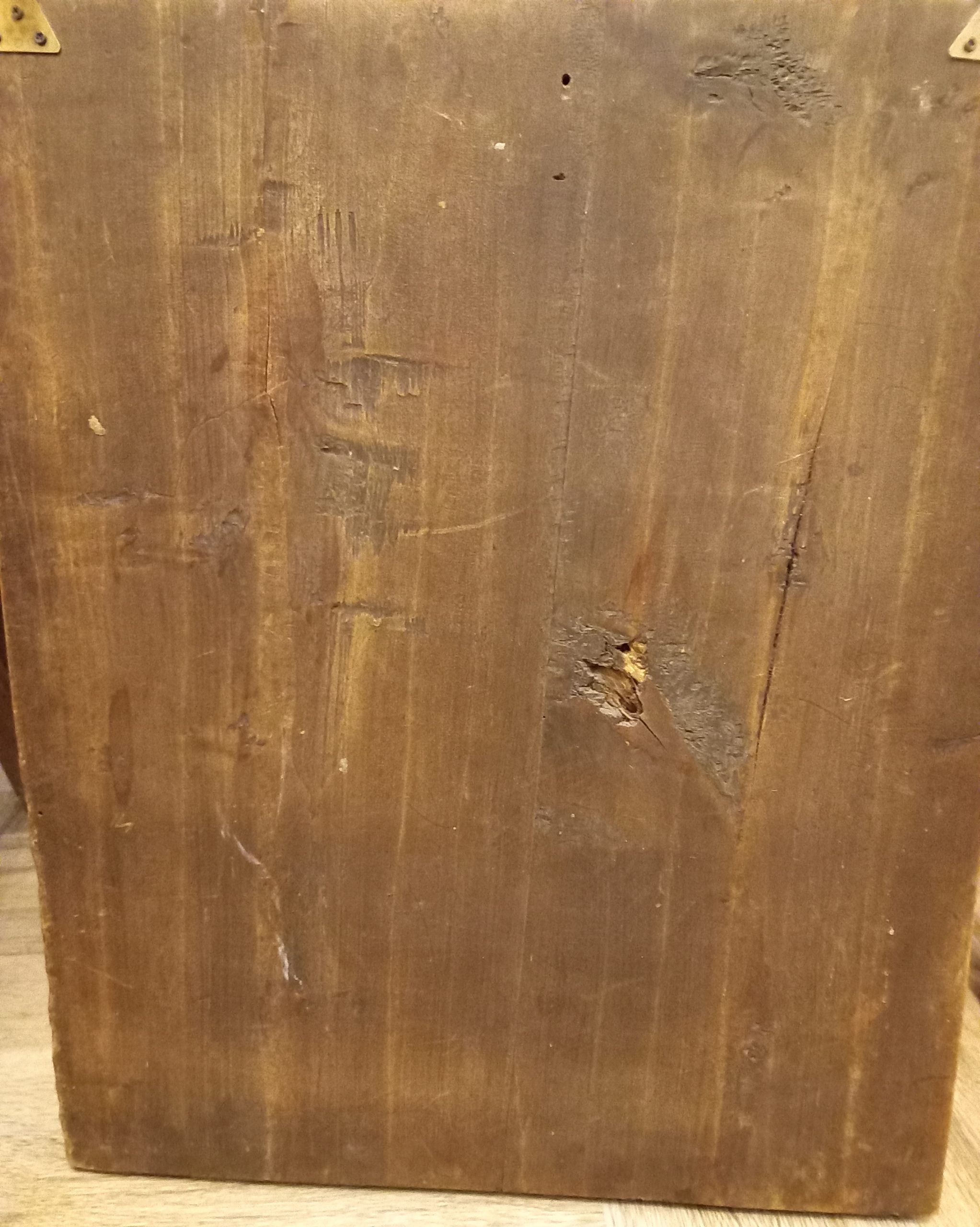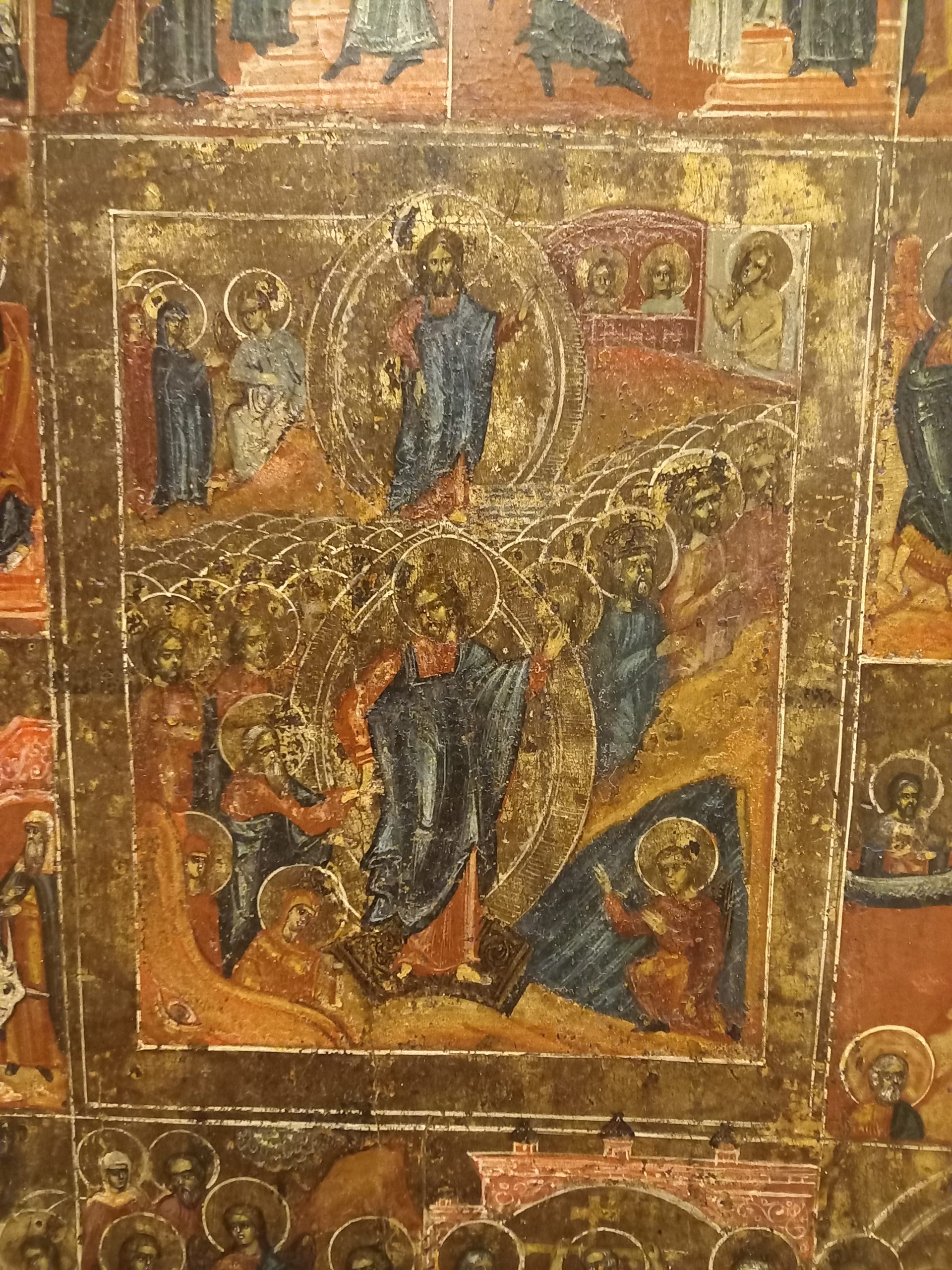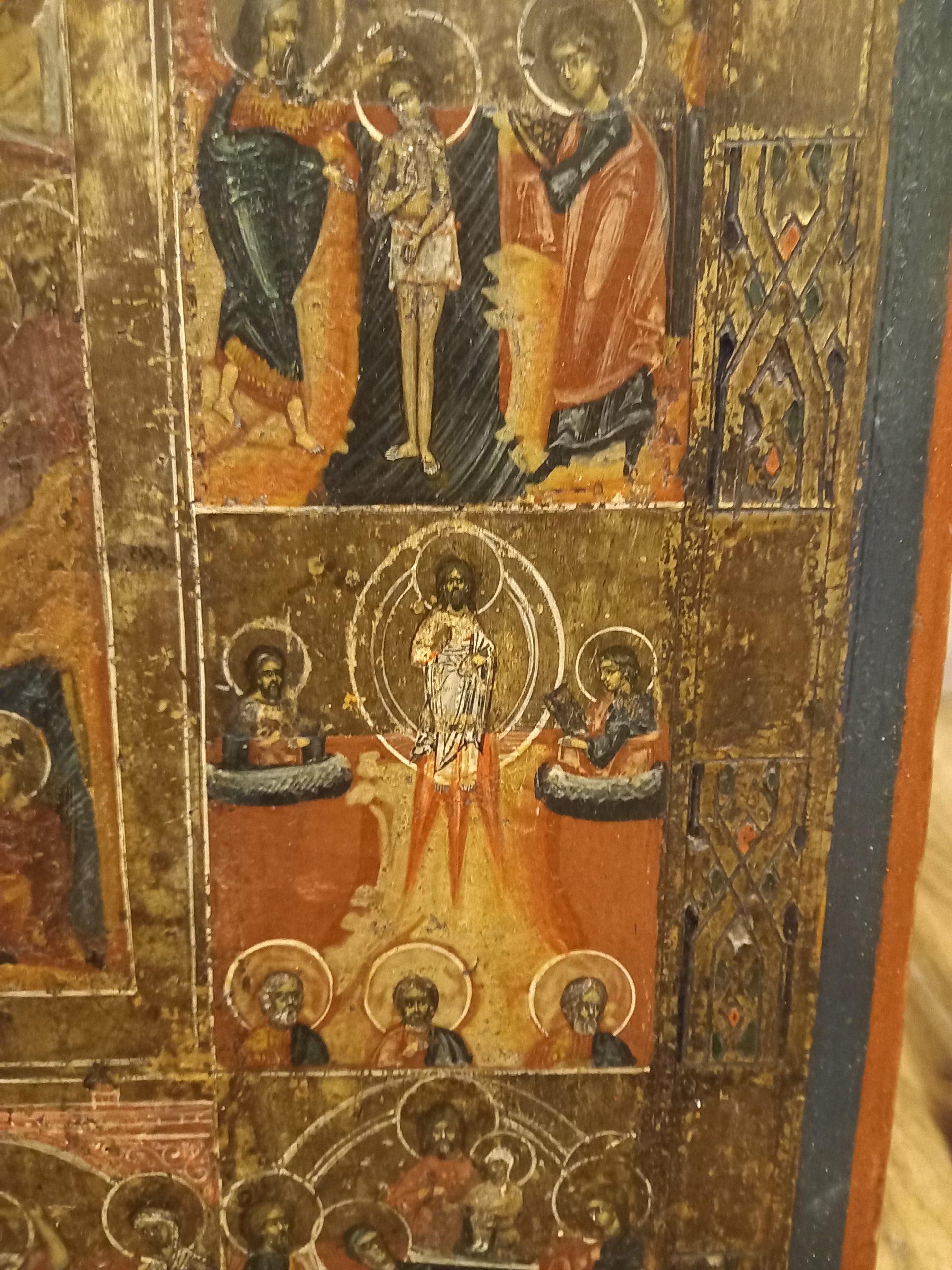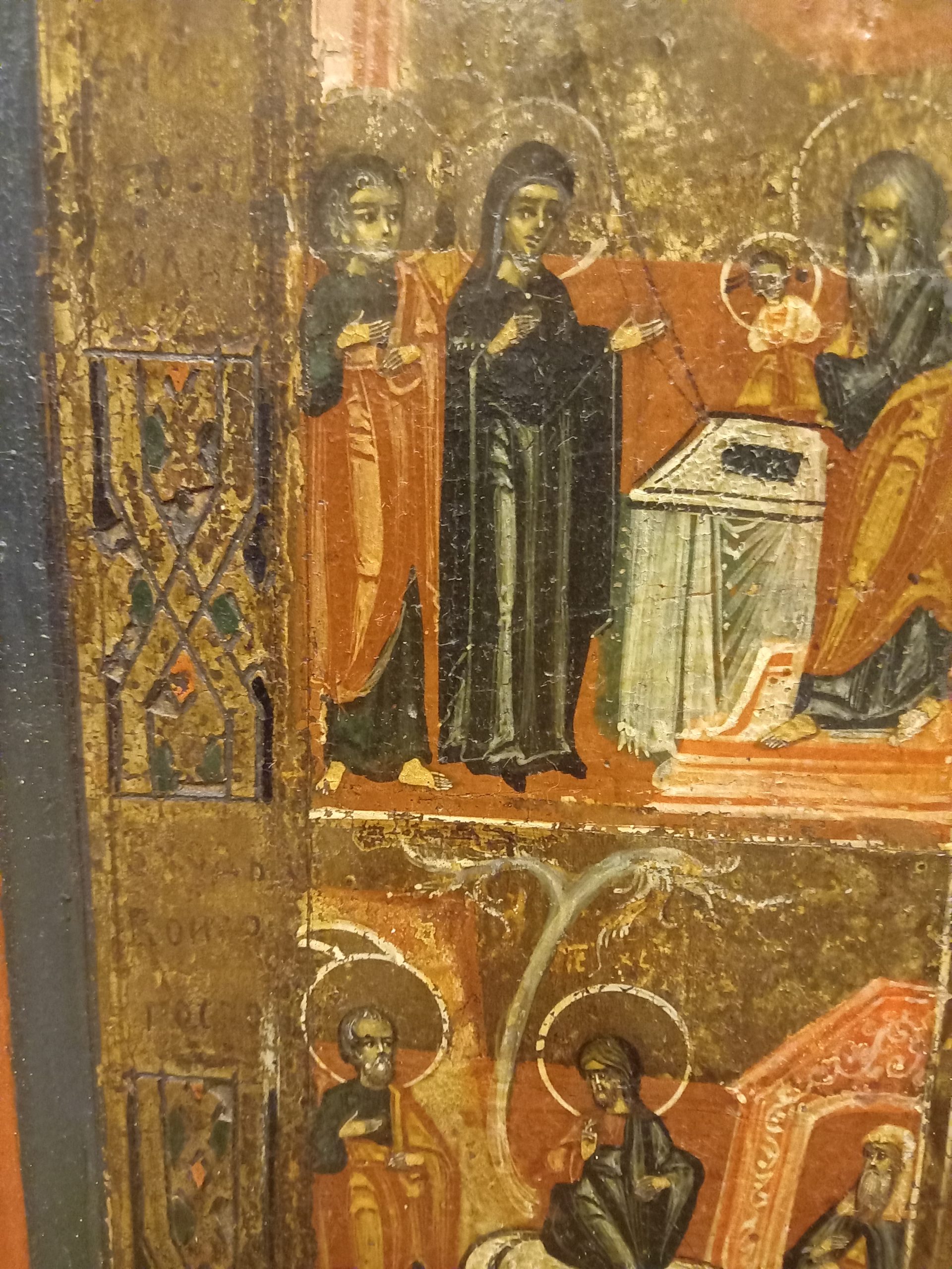 Tempera on wooden panel. A polypartite or compartmentalized icon (kleima scheme), meaning the main image is surrounded by smaller scenes illustrating events from the life of Christ, the Virgin, or the saints. The larger, central scene is clearly the Descent into Hell (Anastasis or Resurrection), which in Orthodox iconography is considered the true representation of Christ’s Resurrection. Jesus is depicted trampling the broken gates of Hell and raising Adam and Eve from their sarcophagi, surrounded by a luminous mandorla. The smaller compartments surrounding the central scene most likely depict the Twelve Great Feasts (Dodekaorton), the main events of the liturgical calendar of the Orthodox Church (e.g., the Nativity, the Presentation in the Temple, the Transfiguration, the Entry into Jerusalem, the Ascension, the Dormition of the Virgin, etc.). This type of icon is very common and was often used for home prayer or as a visual liturgical calendar. The icon is unquestionably of the Russian school. The painting style, colors, composition, and use of gold (or yellow ochre to simulate it) for the background and halos are all typical elements of the Russian tradition. Although the painting style is somewhat “archaic” or “traditional” (with elongated figures and dark colors), the presence of the decorated outer border (which appears to be a carved relief imitation of the edge of a riza) and the relatively simple panel place it in a period of intensive production. It most likely dates to the late 18th or early 19th century (circa 1780–1850). The paint is dark and very worn. Often, icons of this type with compartments were produced in workshops in central Moscow or the surrounding regions for popular sale or for Old Believers (Starovieri), who often favored more traditional and less Westernized styles.The design, with its defined compartments and dark, decorated border (perhaps stamped or molded into gesso/levkas), was a popular form of mass production before icons with metal rizas became prevalent. The wooden panel is thick, with the back showing no integrated or recessed crosspieces, but only traces of old metal hinges or hooks.The paint is very dark, likely due to layers of dirt, smoke, and a heavily oxidized protective varnish (olifa), which gives it a deep, amber appearance. The gold is abraded in many areas, particularly in the central register.