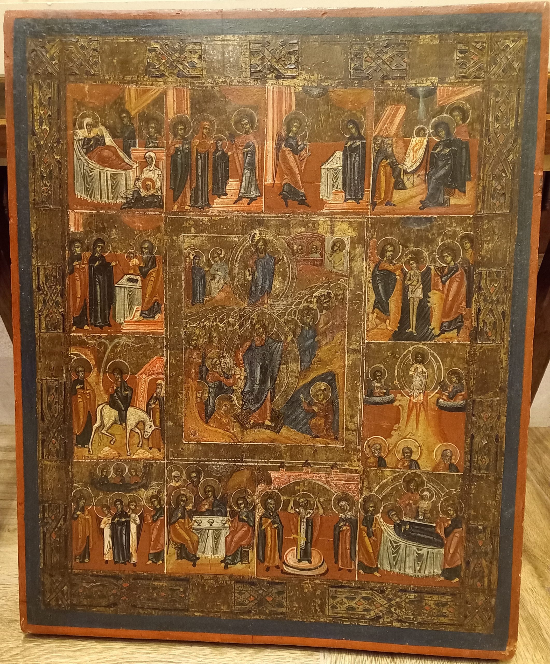 Tempera su tavola di legno. 55 x 44 cm. Icona polipartita o a comparti (schema kлейма), il che significa che l’immagine principale è circondata da scene più piccole che illustrano eventi della vita di Cristo, della Vergine o dei santi: La scena centrale, più grande, è chiaramente la discesa agli Inferi (Anástasis o Resurrezione), che nell’iconografia ortodossa è considerata la vera rappresentazione della Risurrezione di Cristo. Gesù è raffigurato mentre calpesta le porte spezzate dell’Inferno e solleva Adamo ed Eva dai sarcofagi, circondato da una mandorla luminosa. I comparti più piccoli che circondano la scena centrale raffigurano molto probabilmente le Dodici Grandi Feste (Dodekaorton), ovvero i principali eventi del calendario liturgico della Chiesa Ortodossa (es. Natività, Presentazione al Tempio, Trasfigurazione, Ingresso a Gerusalemme, Ascensione, Dormizione della Vergine, ecc.). Questo tipo di icona è molto comune e veniva spesso utilizzato per la preghiera domestica o come calendario liturgico visivo.Icona è indiscutibilmente di scuola russa. Lo stile della pittura, i colori, la composizione e l’uso dell’oro (o giallo ocra per simularlo) per lo sfondo e le aureole sono tutti elementi tipici della tradizione russa. Nonostante lo stile pittorico sia un po’ “arcaico” o “tradizionale” (con figure allungate e colori scuri), la presenza del bordo esterno decorato (che sembra un’imitazione a rilievo intagliata del bordo di una riza) e la tavola relativamente semplice la collocano in un periodo di produzione intensiva. È molto probabile che sia databile al XVIII secolo inoltrato o all’inizio del XIX secolo (circa 1780 – 1850). La pittura è scura e molto consumata. Spesso, icone di questo tipo a scomparti venivano prodotte nei laboratori dei centri di Mosca o delle regioni circostanti per la vendita popolare o per i Vecchi Credenti (Starovieri), che spesso prediligevano stili più tradizionali e meno occidentalizzati.Il design, con i comparti definiti e il bordo scuro decorato (forse stampato o modellato sul gesso/levkas), era una forma popolare di produzione di massa prima che le icone con riza metallica prendessero il sopravvento. Il pannello di legno è spesso, con il retro che non mostra traverse integrate o incassate, ma solo le tracce di vecchie cerniere o ganci di metallo.La pittura è molto scura, probabilmente a causa di strati di sporco, fumo e una vernice protettiva (olifa) molto ossidata, che le conferisce un aspetto ambrato e profondo. L’oro è abrasiato in molte aree, in particolare nel registro centrale.