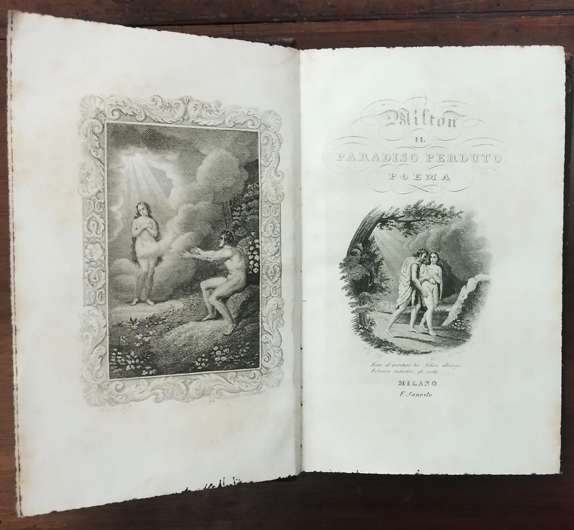In-16 (15 cm) (1) c. (antiporta) (1) c. (frontespizio illustrato) 467 (1).Mezza pelle, piatti telati, caratteri e fregi dorati al dorso. Contropiatti rivestiti di carta marmorizzata Tagli spruzzati di verde. Milton John (1608-1674): Scrittore e poeta. Nato a Londra il 9 dicembre del 1608 e morto nel 1674.