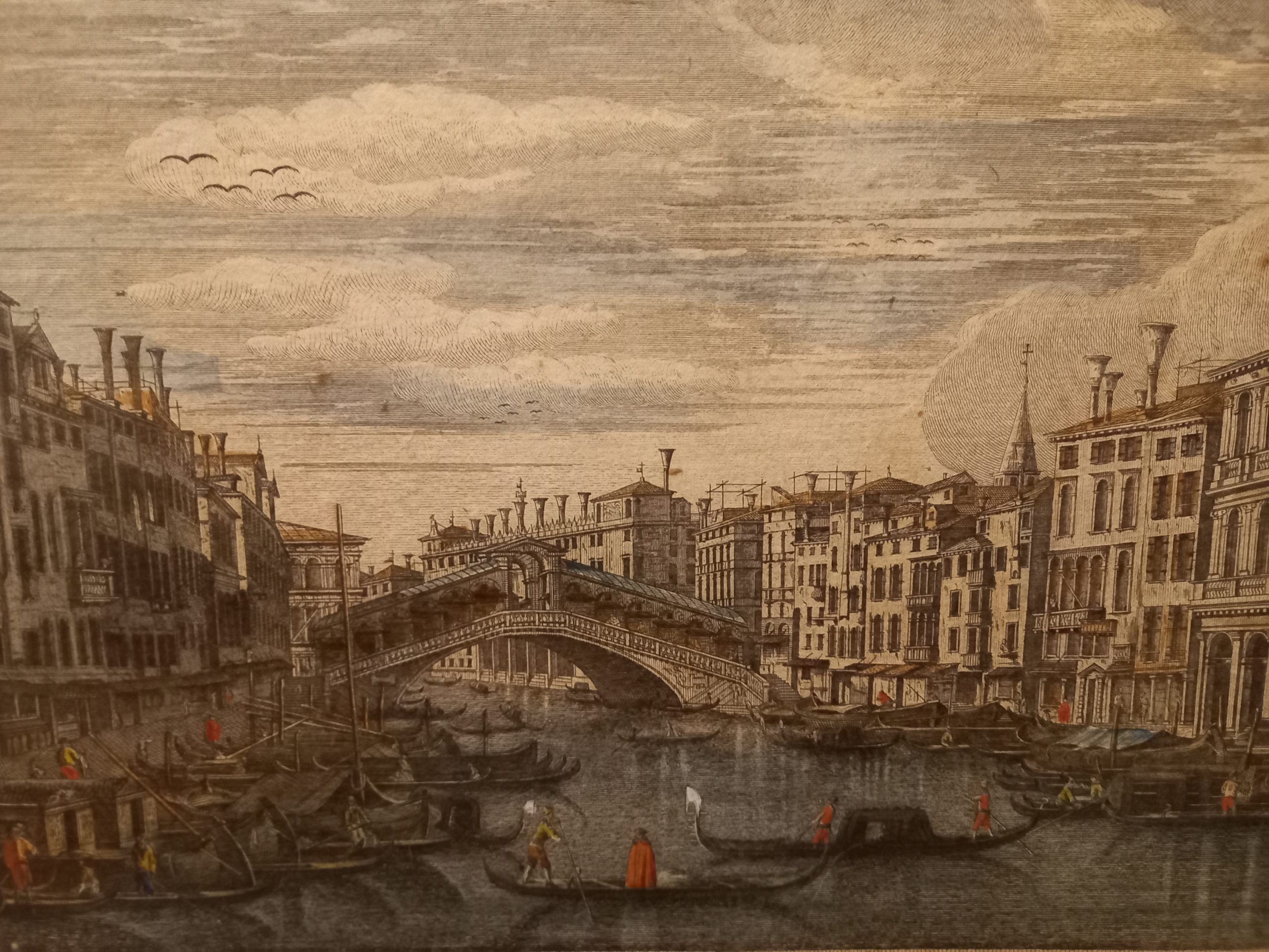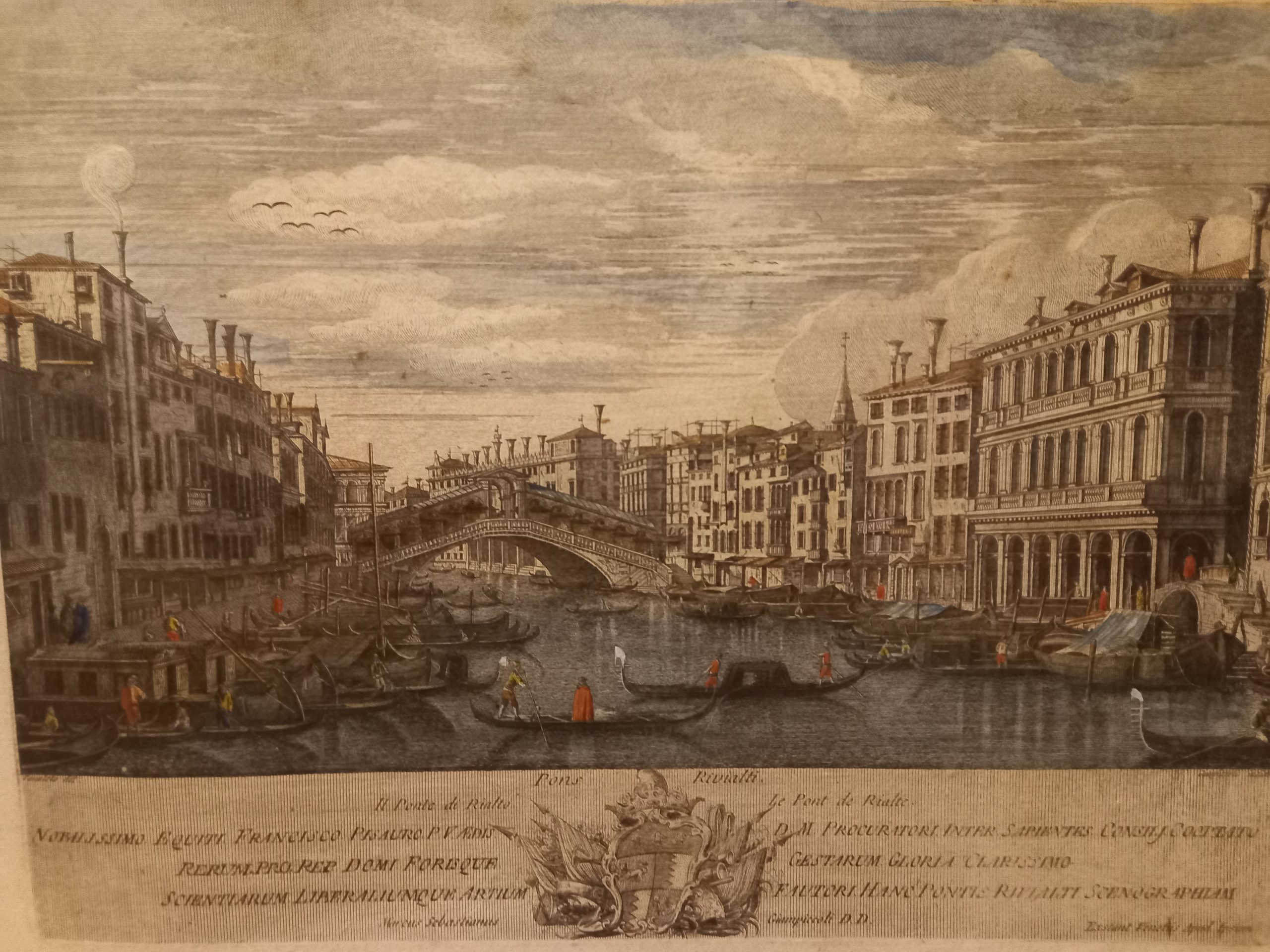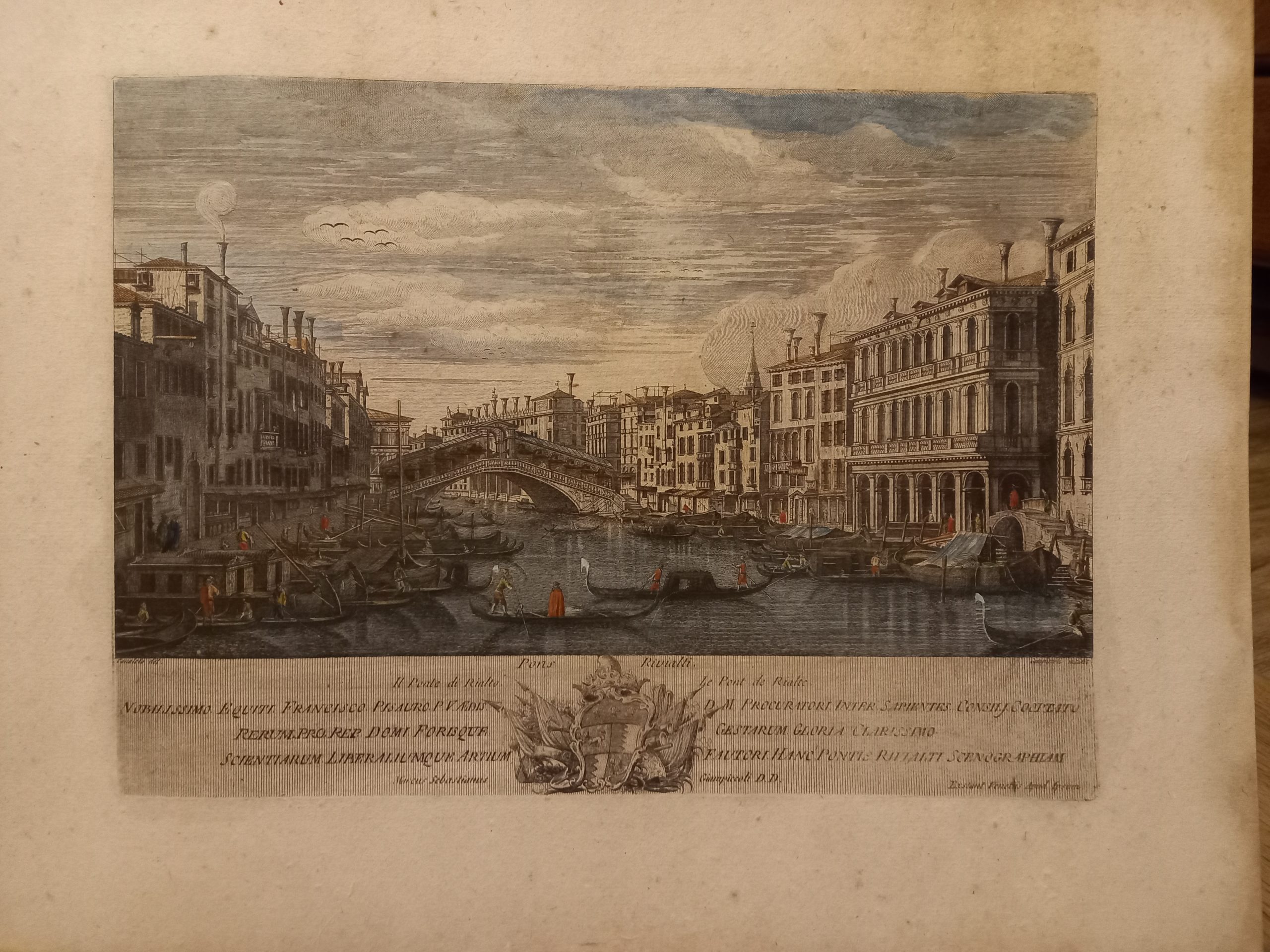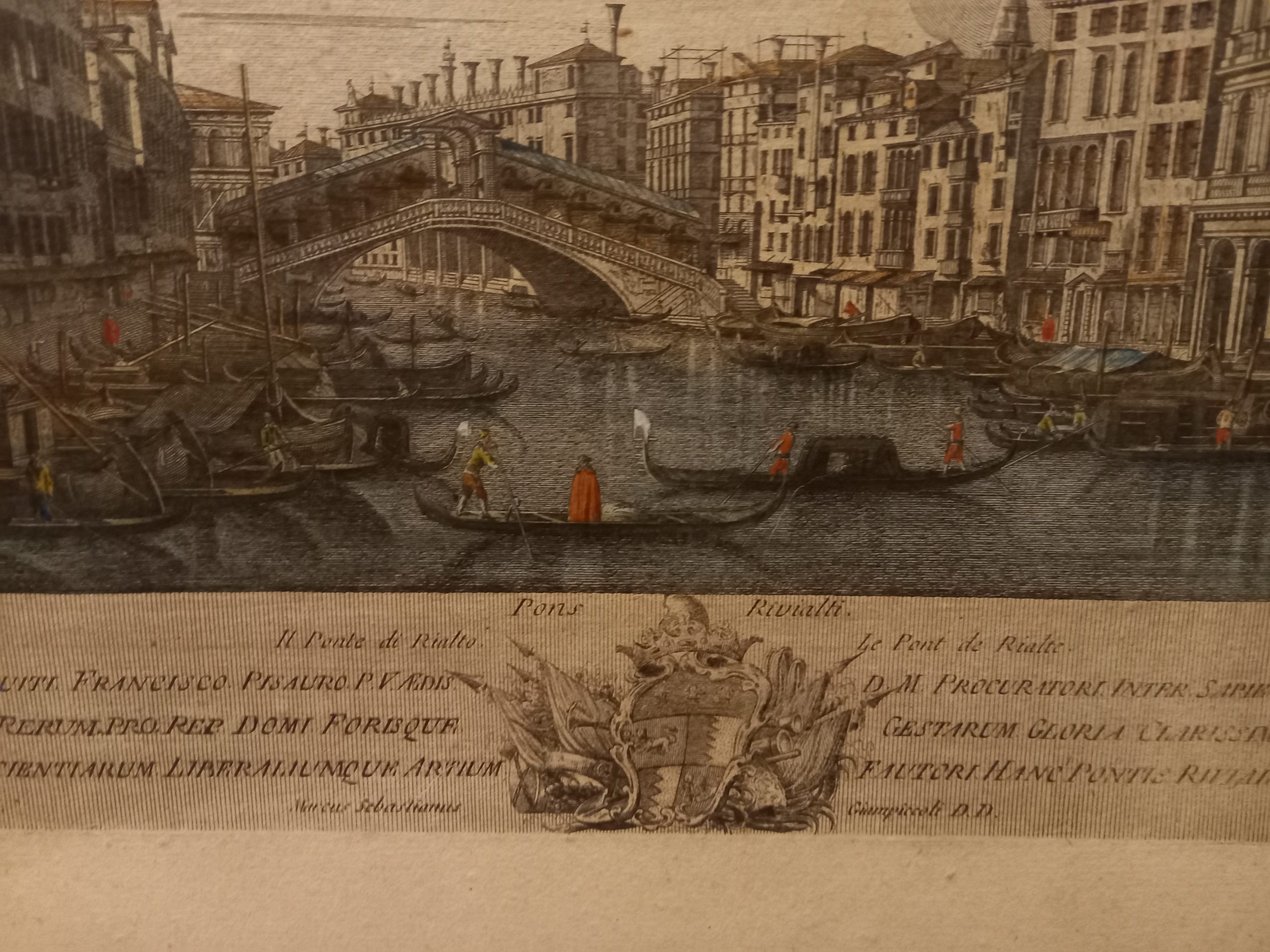 Incisione all’acquaforte e bulino, di mm 320 x 235 inserita in cornice incisa anch’essa all’acquaforte di mm 425 x 340 su foglio contrafondato su cartone. Foglio a ampi margini (50 mm), lievi fioriture diffuse. Sotto l’immagine in piccolo a destra e sinistra “Canaletto del.” “Giampiccoli incidit”; più in grande ai lati del blasone . Succi “Nobilissimo Equiti Francisco Pisauro P.V. AedisDa Carlevarijs ai Tiepolo” pag. 192 in nota: “Di Marco Sebastiano Giampiccoli si ricordano le seguenti principali serie: quarantadue vedute di Venezia derivate da Canaletto, Marieschi, Joinville, del Pedro, P.A Novelli, Battisti. Le vedute, dalle dimensioni di circa 230 x 330 mm sono dedicate perlopiù a Patrizi Veneziani. Queste incisioni esistono anche inserite in una bella cornice di gusto rococò, pure incisa all’acquaforte e firmate in basso a sinistra “Petrus Antonius Novelli inv. et delin.”. Oppure in una cornice quasi simile, ma più accuratamente rifinita di formato leggermente maggiore (361 x 446 anziché 357 x 440).