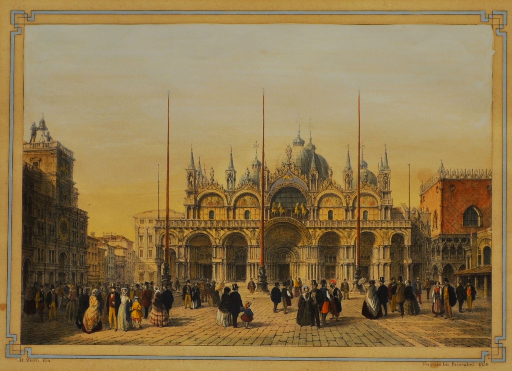 Litografia, 330 x 465 mm. Bellissima coloritura d’epoca. In basso a sinistra in piccolo “M. Moro dis.”, a destra “Venezia Lit. Brizeghel “. Sotto in grande “Marcuskirche”. Fa parte della edizione tedesca di : Venezia prospettica, monumentale, storica, artistica… con sessanta tavole litografiche disegnate da Marco Moro e da Giuseppe Rebellato… Venezia, Giovanni Brizeghel editore, Tip. Lit. Calc. e Libraio, Procuratie Vecchie N. 137.