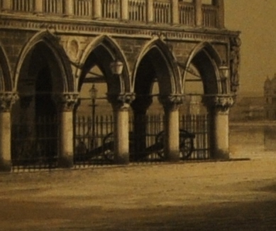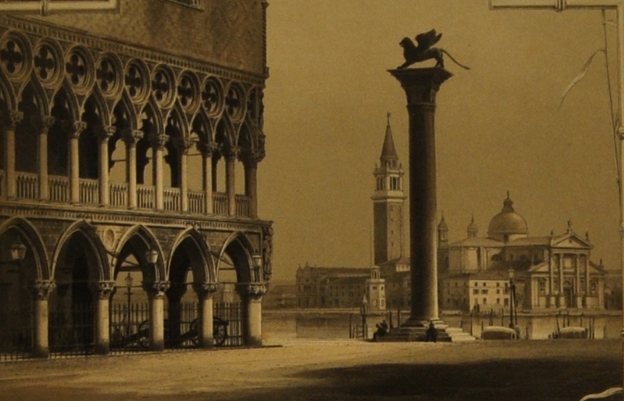 Cromolitografia di mm 460 x 360 su carta spessa. Interessante la immagine dei portici di Palazzo Ducale con i cannoni austriaci.