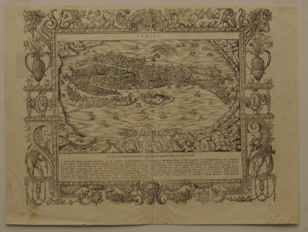 (370 X 300) mm dimensione della tavola. (157 X 252) mm dimensione della veduta. Filigrana con lettera B sormontata da giglio. Incisore anonimo. Proviene da “La Cosmographie universelle de tout le monde”. Belle Forest Francois (1530-1585). Cassini N.21: “La pianta è inserita in una sontuosa cornice architettonica, ricca di elementi araldici, putti, animali, ecc. In alto, al centro in caratteri tipografici “Pourtraict de la magnique Citè de Venise”. Nell’interno della cornice e al di sopra della pianta:”Venise”. Lungo il lato inferiore, entro il riquadro, 71 rimandi in italiano, segnati da lettere. Al centro del lato sinistro della cornice, entro uno scudo, il monogramma dell’editore Nicolas Chesneau che esercitò pure l’attività di incisore in alcune opere uscite a Parigi tra il 1556 e il 1583. Al centro del lato opposto, entro uno scudo, il monogramma di un artista ignoto, probabilmente un disegnatore tedesco della seconda metà del XVI secolo.” Moretto N. 31.