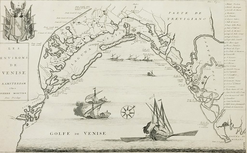 Intaglio engraving measuring 266 x 420 mm at the edge, on a sheet measuring 342 x 558 mm. The sheet comes from Abraham Nicolas Amelot de la Houssaie’s work ‘Histoire du gouvernement de Venise’ printed in Amsterdam by Pierre Mortier in MDCCV (1705). Sheet intact, slightly oxidised, as is typical of Dutch paper. Numerous place names, mainly of a hydrographic nature.