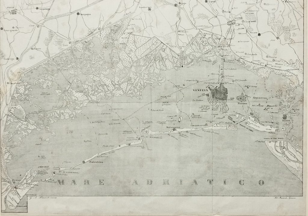 Litografia di 280 x 420 mm. che abbraccia l’intera laguna di Venezia, dalla città di Chioggia fino all’arcipelago torcellano. Interessanti i dettagli idrografici, sia quelli relativi alla parte fluviale, che quelli relativi alla navigazione interna. (EN) Lithograph measuring 280 x 420 mm, covering the entire Venice lagoon, from the city of Chioggia to the Torcello archipelago. Interesting hydrographic details, both those relating to the river and those relating to inland navigation.