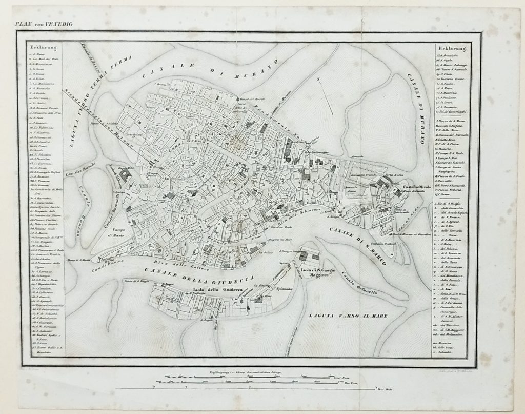 Incisione in acciaio di mm 185 x 253.All’angolo sinistro del margine superiore: Plan von Venedig. Lungo il margine inferiore: Gez. V. Gross. Lith. Anst. C. W. Pobuda. Più sotto tre scale metriche. 77 rimandi disposti su due colonne, ai lati ndella pianta. (Moretto. Venezia. Le immagini della continuità N 314)