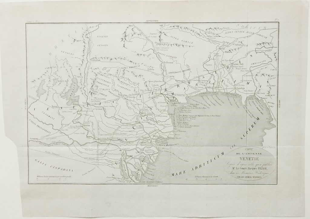 Engraving on steel measuring 352 x 225 mm. This historical representation of the Veneto region and the Venice Lagoon as it must have been in the Iron Age is a copy of the one made by Jacopo Filiasi for his work ‘Memorie storiche dei Veneti primi e secondi’ (Historical Memoirs of the First and Second Venetians), printed for Pierre Darù’s Histoire de Venise in 1853.