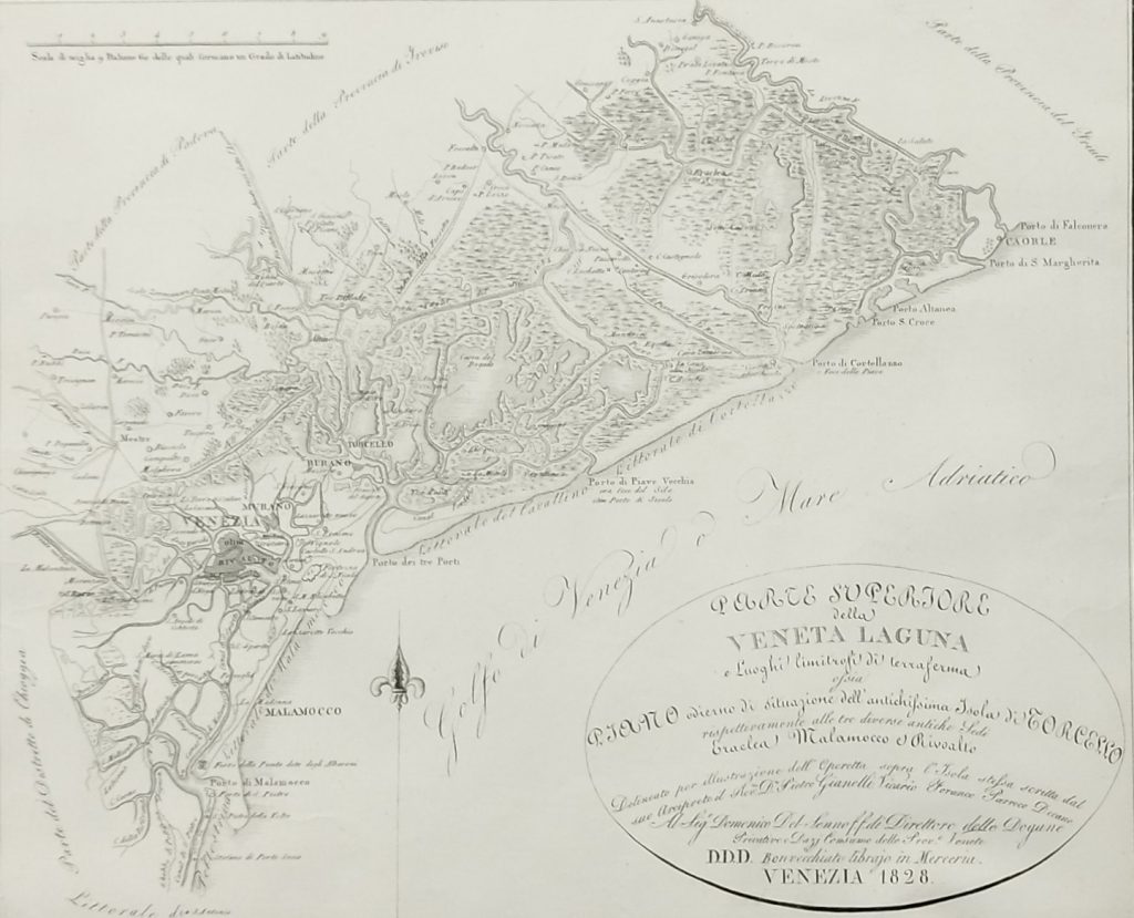 Copper engraving measuring 375 x 310 mm depicting the northern part of the Venetian Lagoon. As stated in the description on the map, this engraving was created to illustrate the work of Reverend Pietro Giannelli on the island of Torcello.