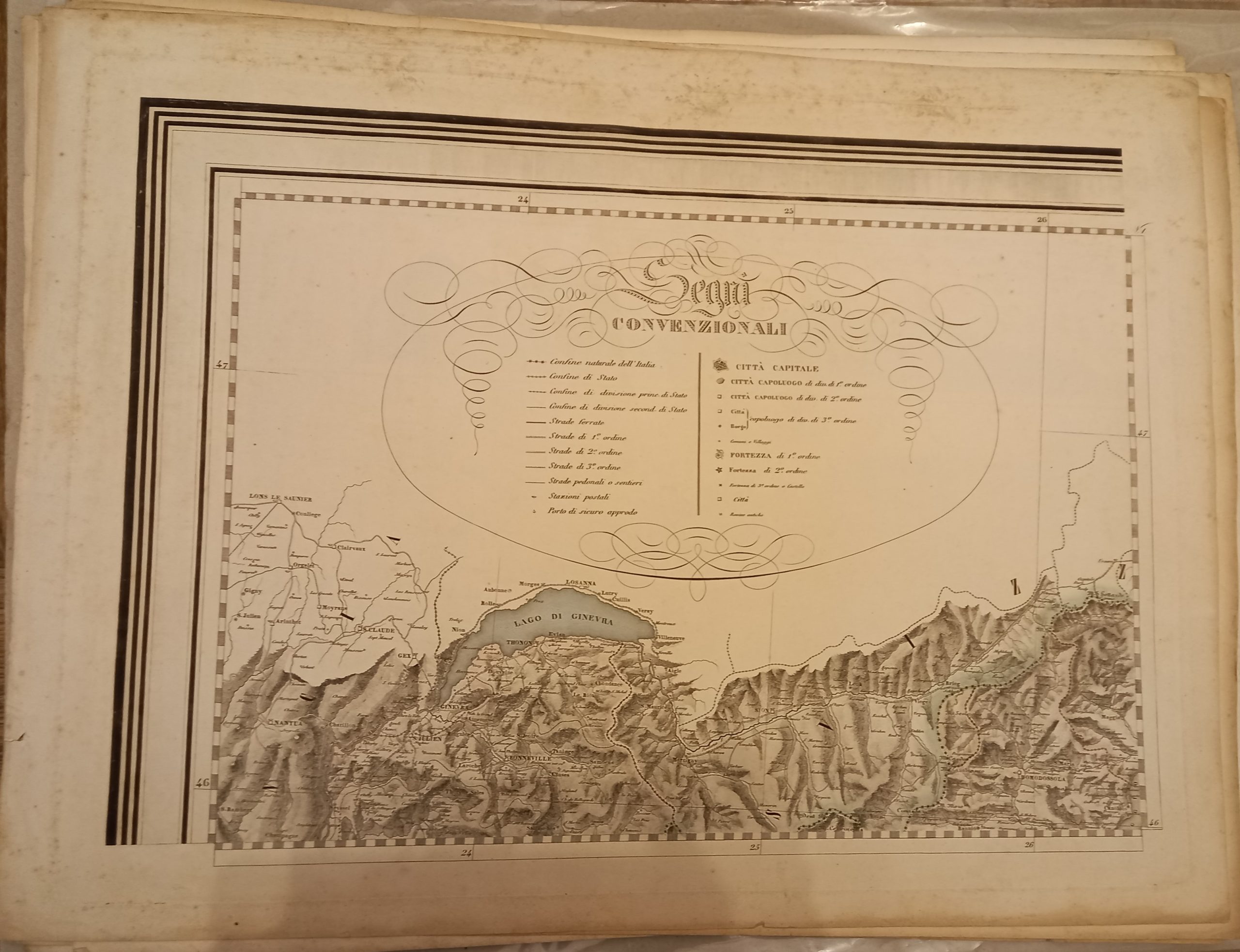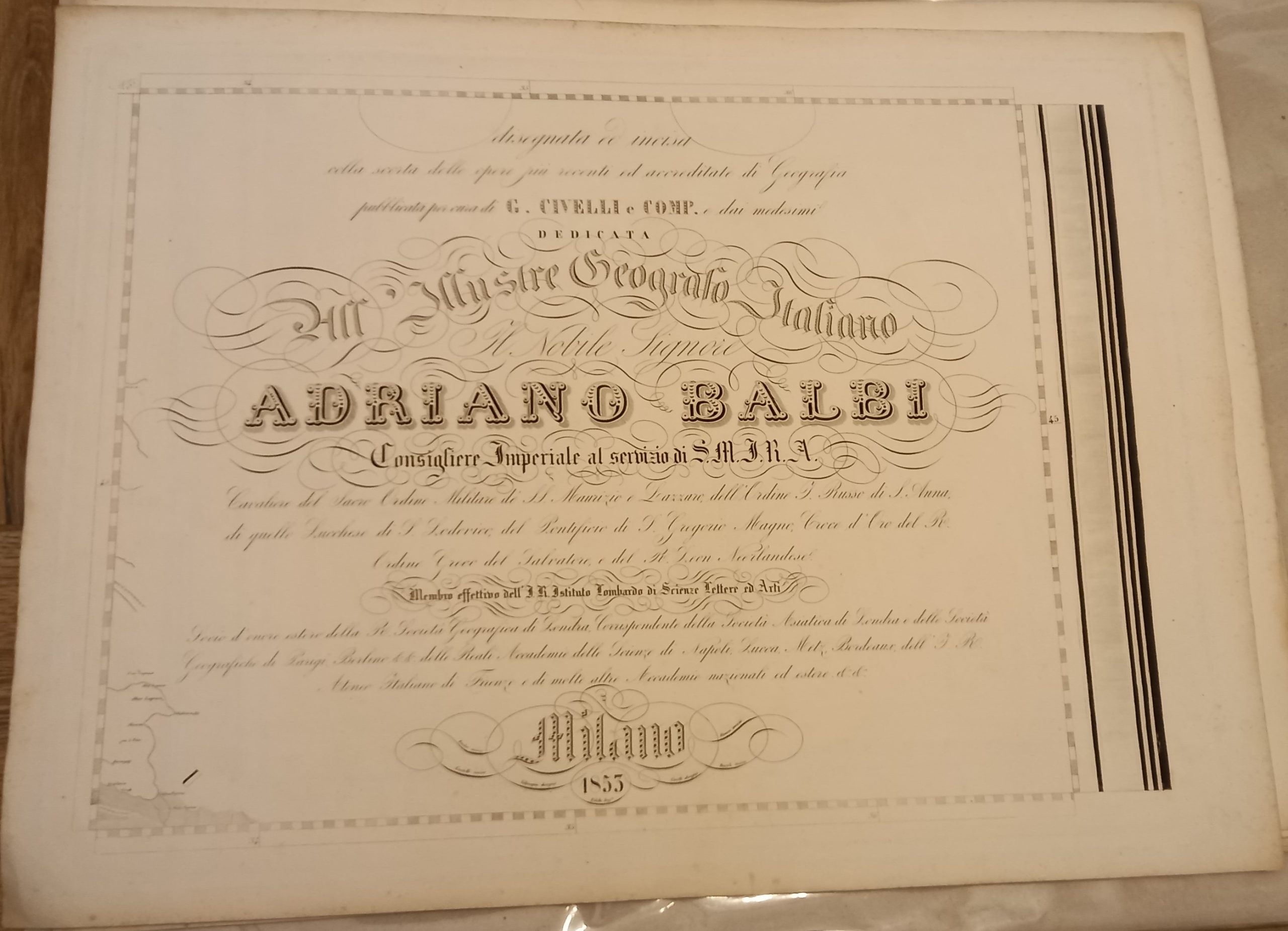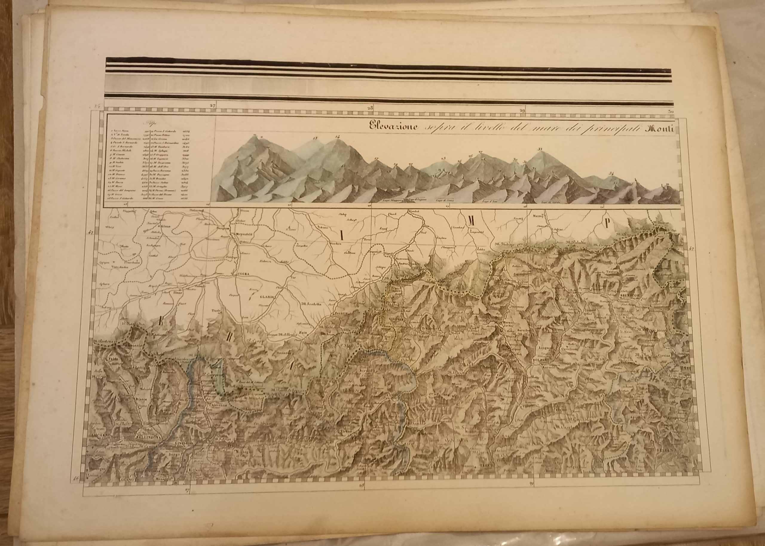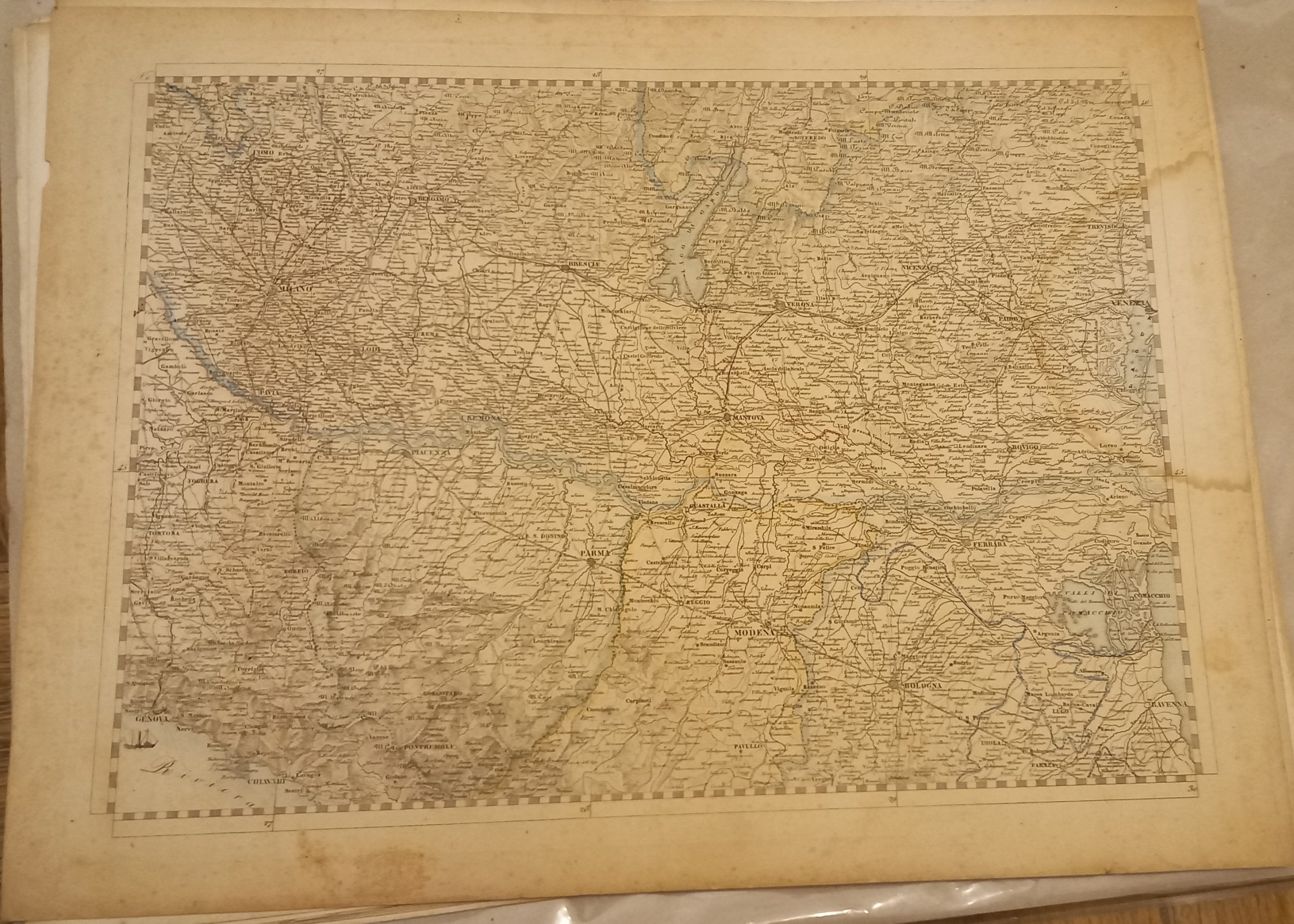 Serie di 28 tavole incise in rame di mm 545 x 405 su carta di cellulosa a comporre una grande carte dell’Italia di mm 1980 x 2500. Confini acquarellati a mano. Ottimo esemplare. Questa notevole carta venne dedicata dall’editore ad Adriano Balbo.
