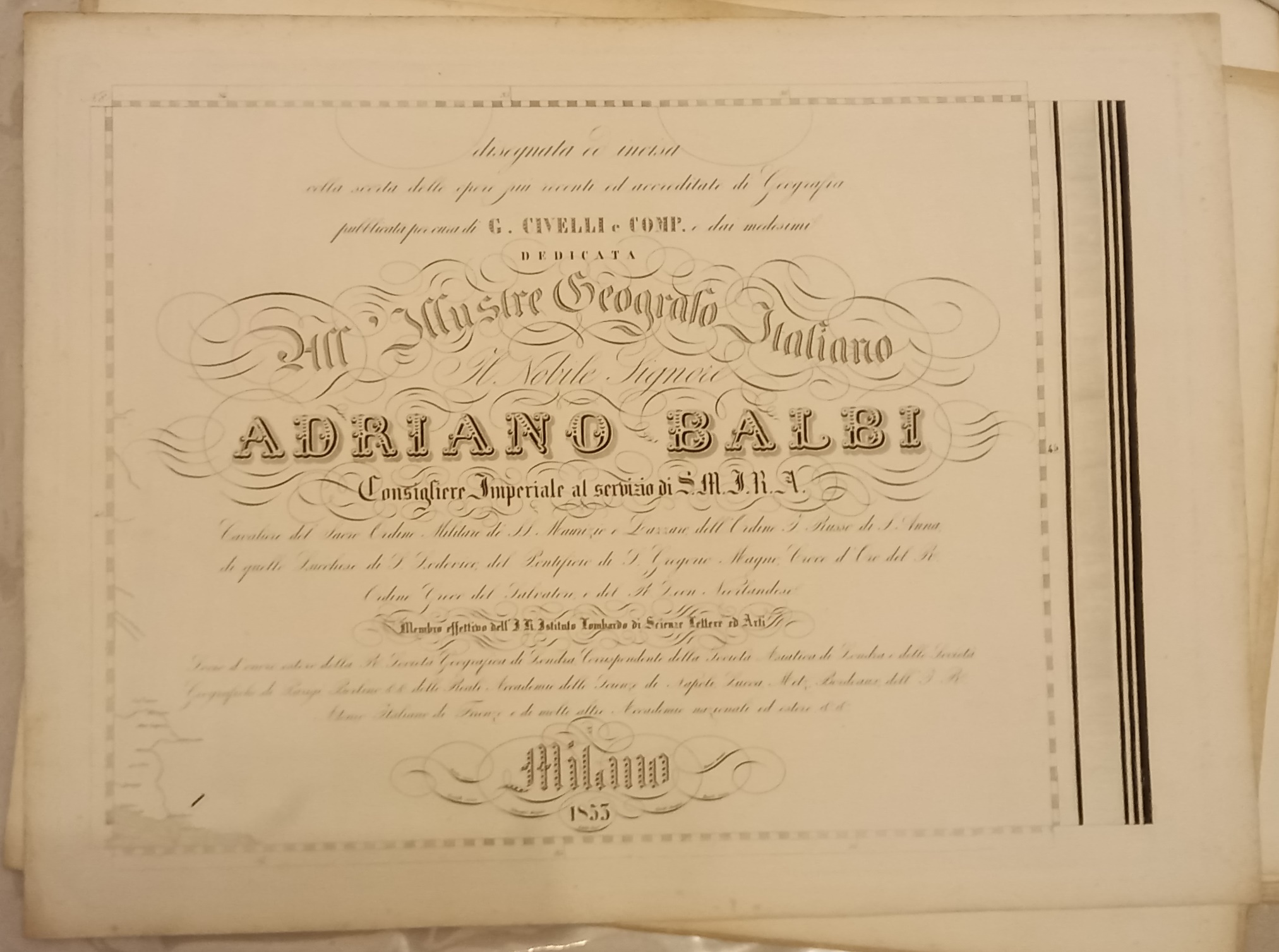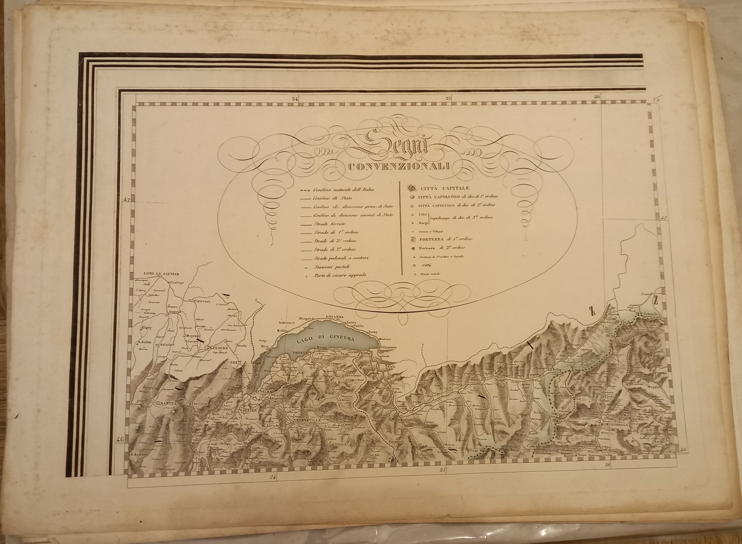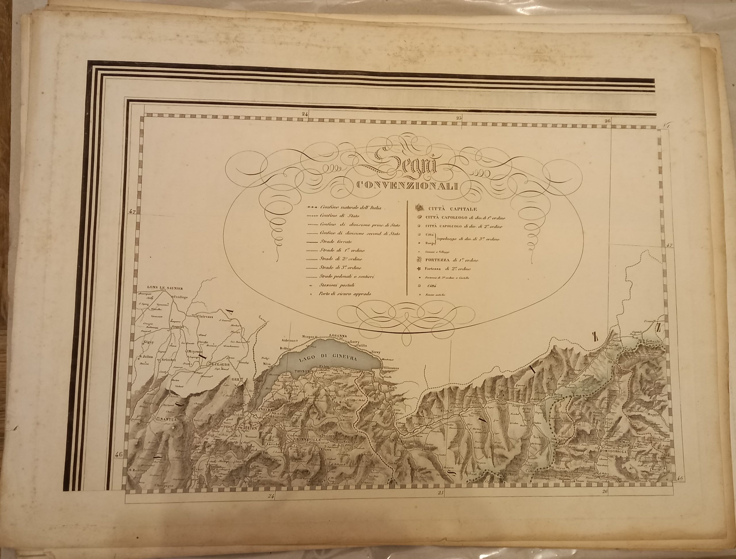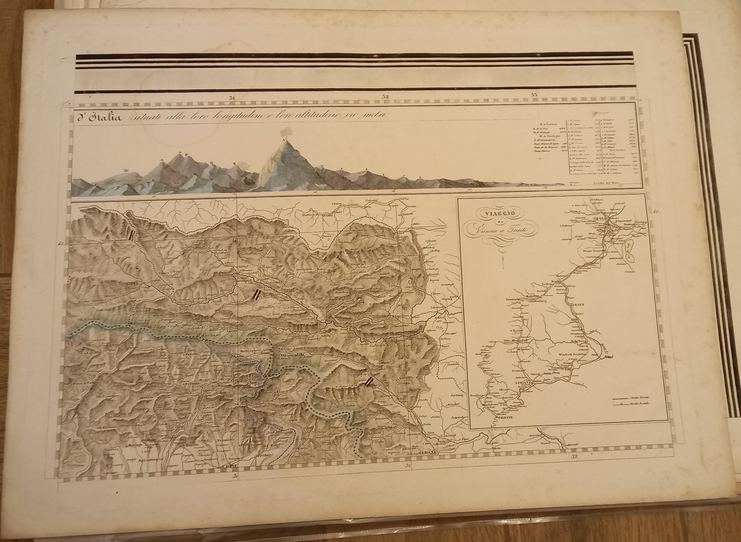Serie di 28 tavole incise in rame di mm 545 x 405 su carta di cellulosa a comporre una grande carte dell’Italia di mm 1980 x 2500. Confini acquarellati a mano. Ottimo esemplare. Questa notevole carta venne dedicata dall’editore ad Adriano Balbo.