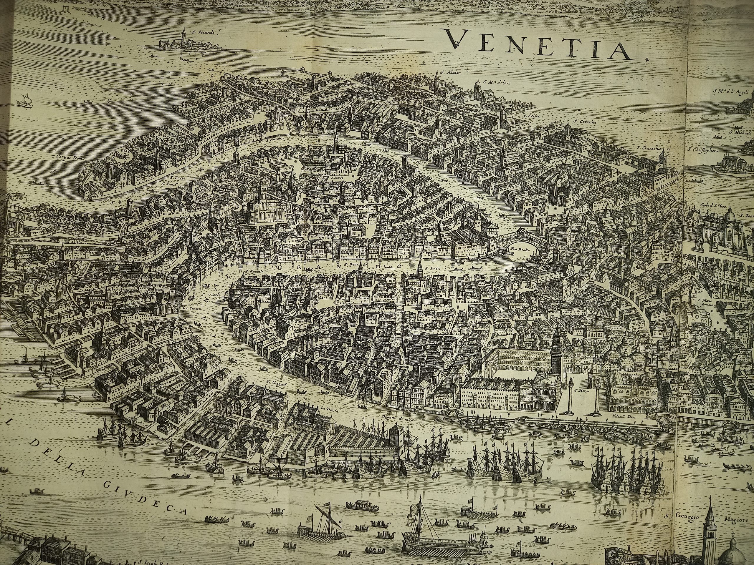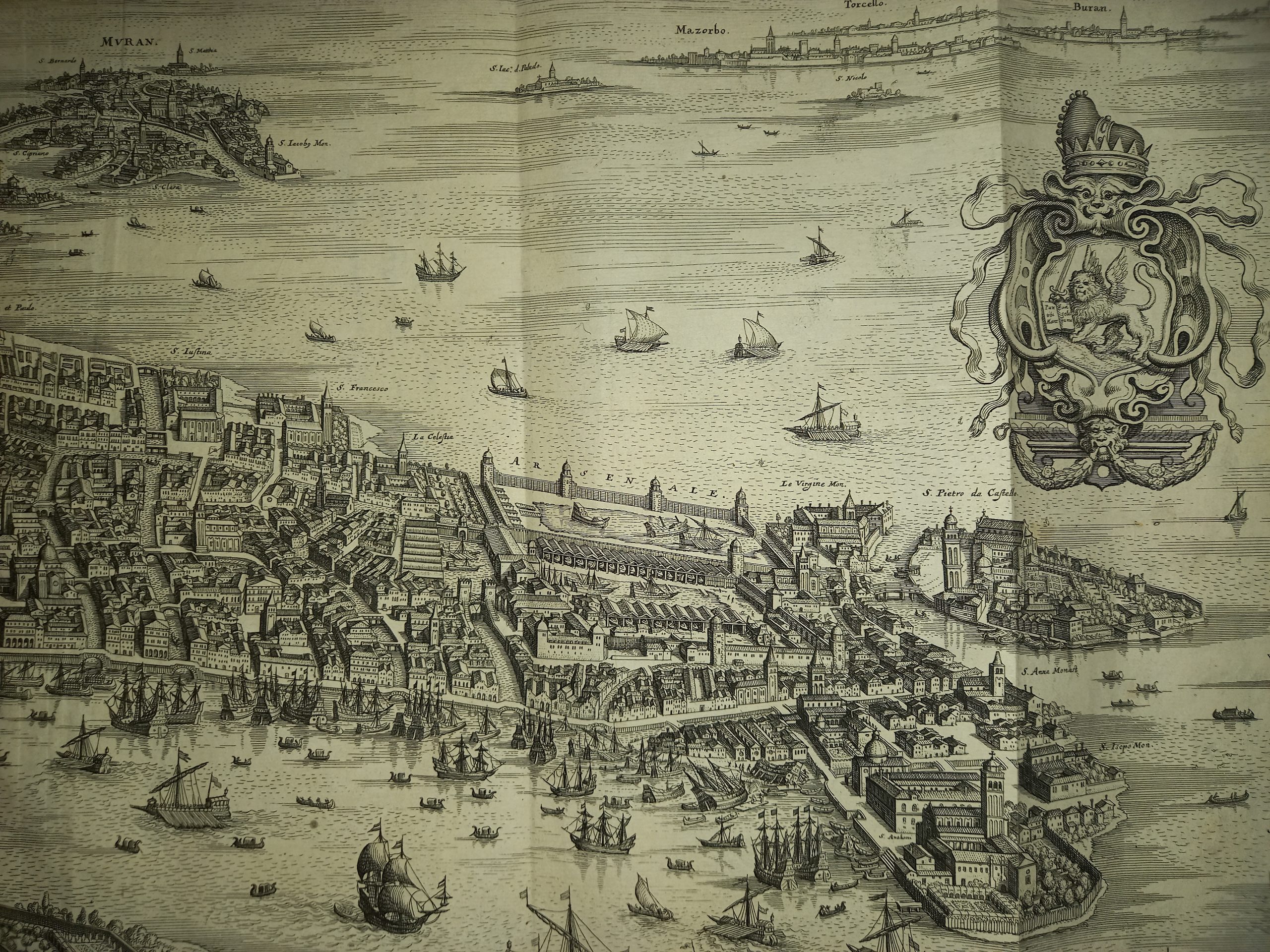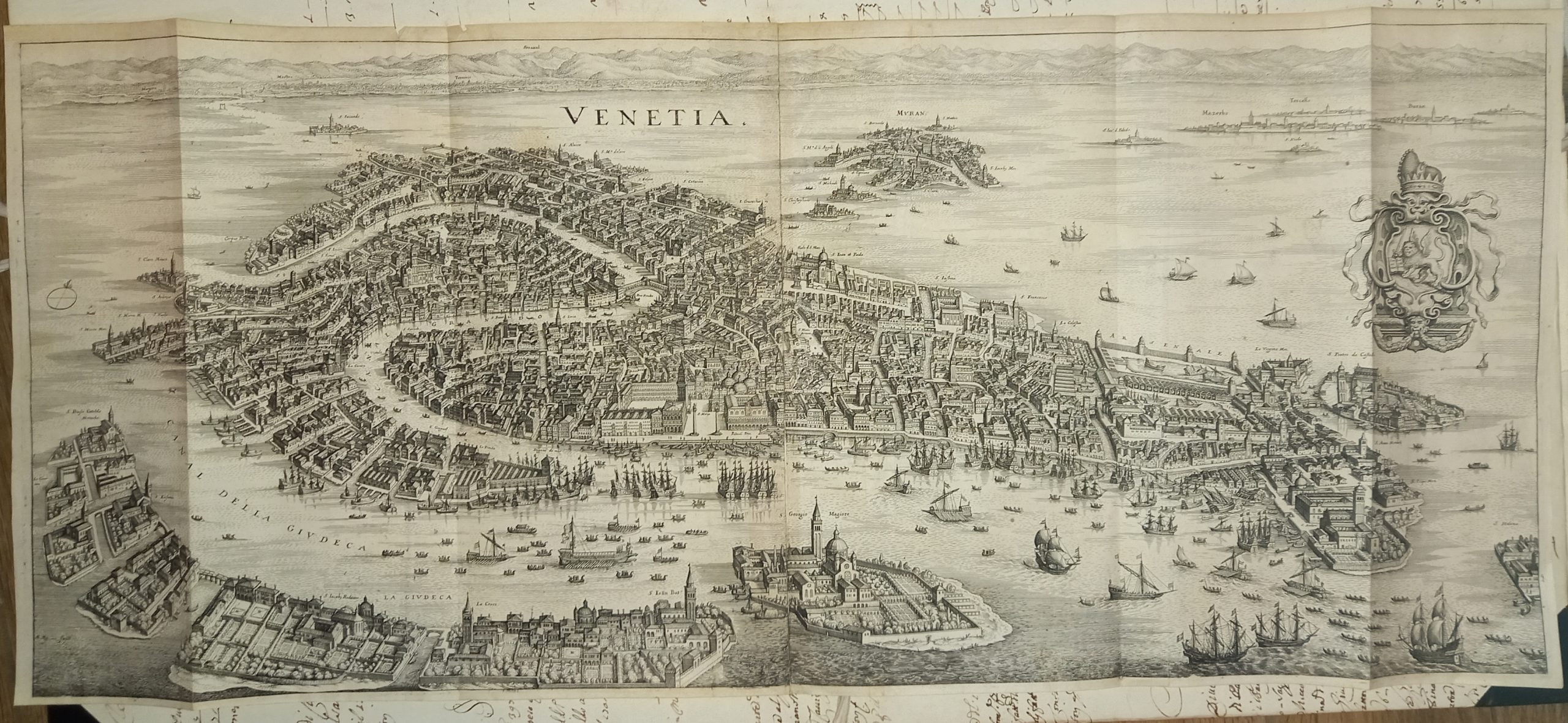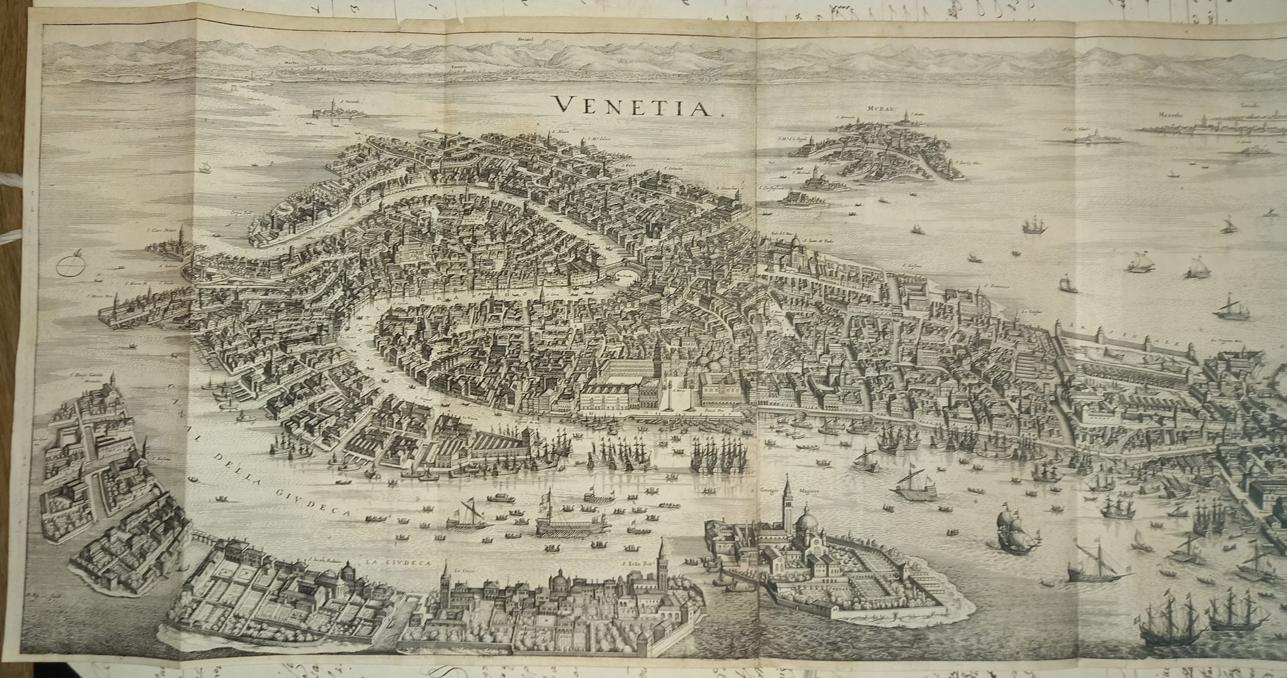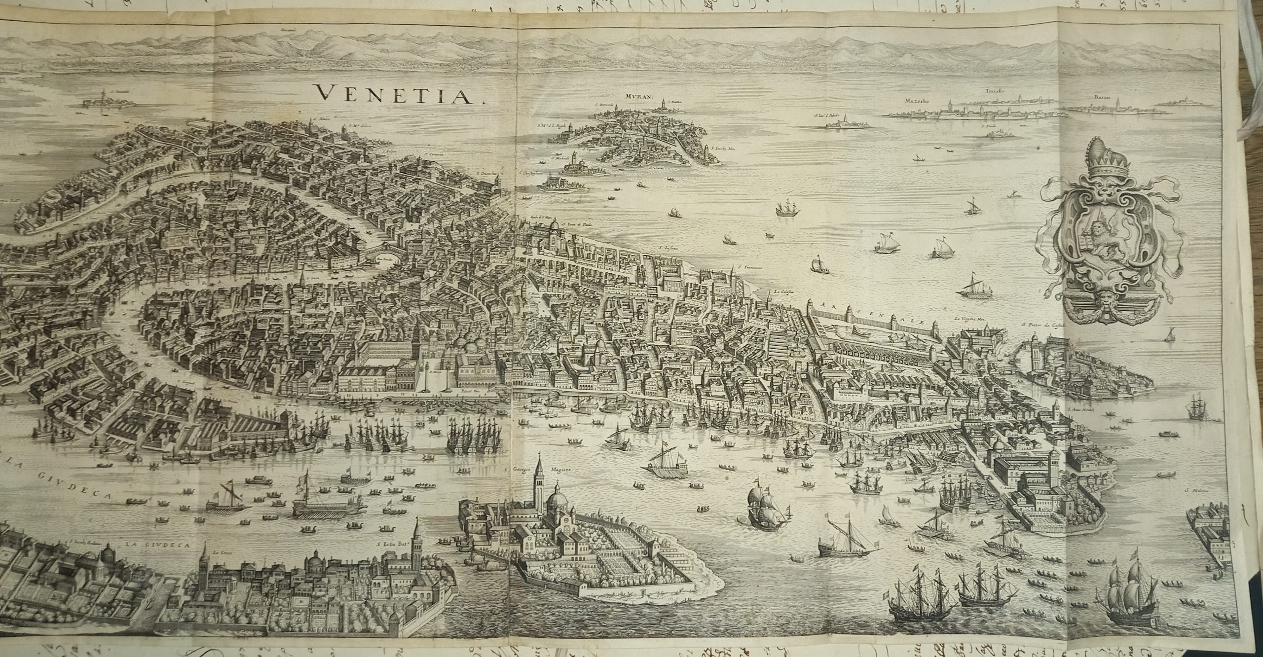 Incisione in rame su due lastre, compl. di mm. 305 x 715. Vergatina leggera. Filigrana non rilevata. In alto al centro del titolo “Venetia”; più a destra il leone marciano entro cartiglio araldico sormontato dal corno ducale. Nell’angolo inferiore sinistro si legge “M. Merian fecit”. Molti toponimi nella pianta. Piccolo foro appena rilevabile. Margini bianchi ridotti. Provienenza: “Theatrum Europaeum, oder Aussfuhrliche und Warhafftige Beschreibung aller und (…) Jahr Christi 1617 bis 1629 (…) Beschrieben durch M. Joannem Philippum Abelinum gezieret”. Questa pianta, stampata in varie edizioni, fu molto conosciuta anche oltre i confini della Germania ed influenzò per tutto il secolo buona parte della iconografia veneziana. La sua fortuna derivò dalla precisione e nitidezza dell’intaglio, ricco di dettagli leggibili, oltre che dal formato oblungo che ben si addice alla forma della città. Ma ciò che più conta, pensiamo sia stato il modello al quale si riferisce il Merian, che senza alcun dubbio è la pianta di Jacopo de’ Barbari. E’ la prima volta, dopo quasi un secolo e mezzo di oblio, che l’insegnamento del maestro del Caduceo abbia trovato un intelligente seguace che si sia liberato del convenzionalismo didascalico delle rappresentazioni cinquecentesche. Naturalmente molti particolari topografici sono omessi per poter mantenere una sufficiente chiarezza dei luoghi e degli edifici principali in dimensioni ridotte. (Cassini, Piante e vedute prospettiche di Venezia). Schulz (1970), n°66. Cassini (1971), n°40. Romanelli Biadene (1982) n°33. Moretto (2001), n°69.Copper engraving on two plates, compl. of mm. 305 x 715. Light laid paper. Unmarked watermark. At the top centre of the title “Venetia”; further to the right the lion of St. Mark within a heraldic cartouche surmounted by the ducal horn. In the lower left corner one reads “M. Merian fecit”. Many toponyms in the plan. Small, barely noticeable hole. Reduced white margins. Provenance: “Theatrum Europaeum, oder Aussfuhrliche und Warhafftige Beschreibung aller und (…) Jahr Christi 1617 bis 1629 (…) Beschrieben durch M. Joannem Philippum Abelinum gezieret”. This plan, printed in various editions, was well known beyond the borders of Germany and influenced a good part of Venetian iconography throughout the century. Its fortune derived from the precision and clarity of the carving, rich in legible details, as well as from the oblong format that is well suited to the shape of the city. But what matters most, we think, was the model to which Merian refers, which is without a doubt the plan of Jacopo de’ Barbari. It is the first time, after almost a century and a half of oblivion, that the teaching of the master of the Caduceus has found an intelligent follower who has freed himself from the didactic conventionalism of sixteenth-century representations. Naturally many topographical details are omitted in order to maintain sufficient clarity of the places and main buildings in reduced dimensions.