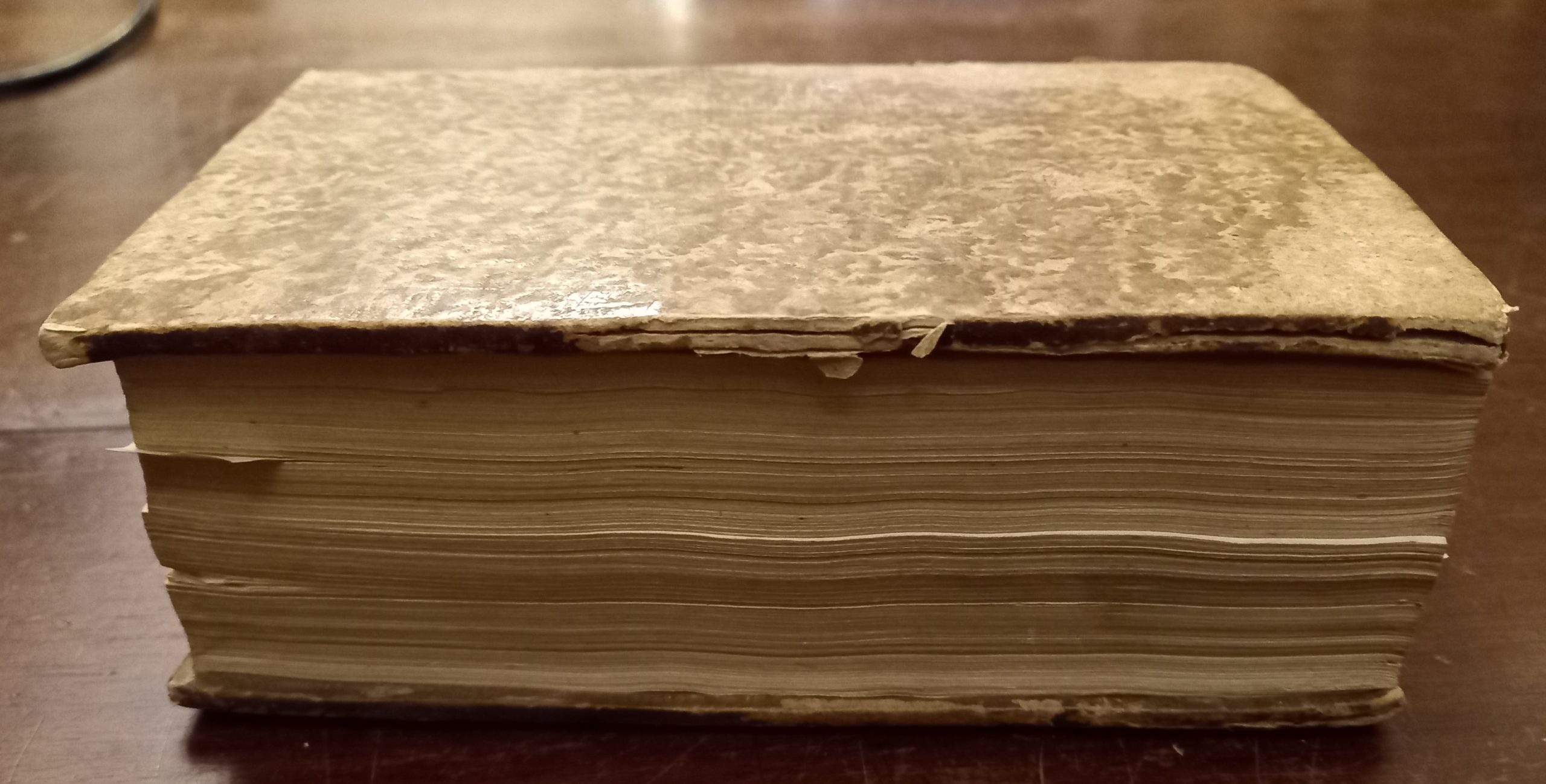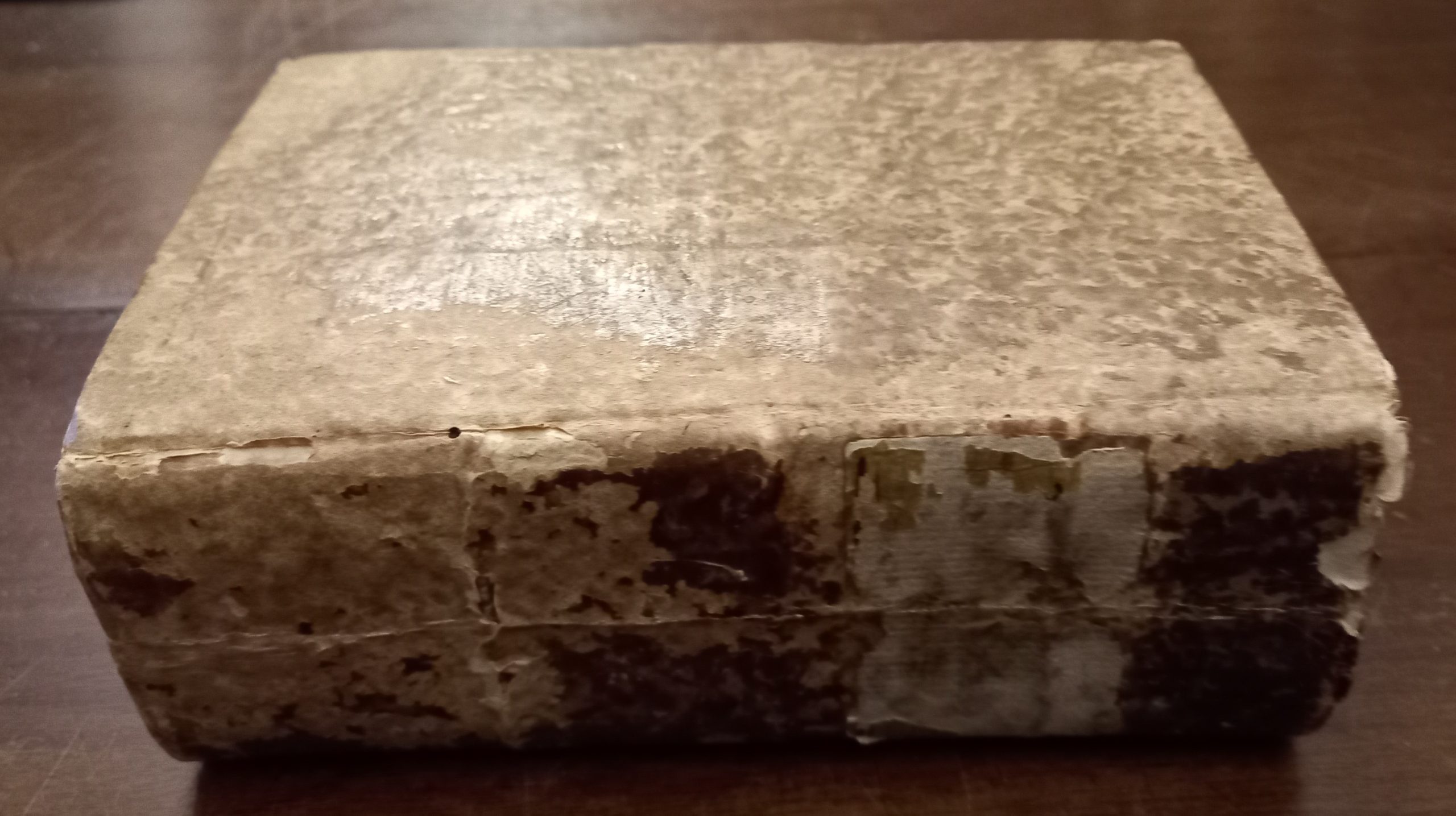 In-8 (15 cm) (8) c. 456 c. (3) c. Marca editoriale xilografata al frontespizio rappresentante un pellicano che si squarcia il petto per nutrire i piccoli con motto: Offendo me per voi solo nutrire. Piatti cartonati rivestiti di carta marmorizzata, ora piuttosto usurata. Pietro Lombardo (1095-1160) nacque probabilmente tra il 1095 e il 1100 a Lumellogno, nei pressi di Novara. Sono tuttavia le Sentenze a costituire l’opera principale di Pietro Lombardo che gli valse l’appellativo di Magister sententiarum. Si tratta di una raccolta di sentenze teologiche ordinate sistematicamente in quattro libri, a loro volta suddivisi in capitoli, in cui la materia teologica è presentata sotto forma di questioni, per rispondere alle quali Pietro riporta prevalentemente, ma non esclusivamente, estratti da commentari biblici, opere patristiche, o altri scritti di autori medievali. Lo scopo dell’opera è quello di raccogliere in un solo scritto tutto il materiale indispensabile per l’insegnamento della teologia agli studenti. L’opera fu composta in una prima versione tra il 1155 e il 1157, per poi subire aggiunte e correzioni tra il 1157 e il 1158.Nel primo libro, Pietro affronta i problemi inerenti la trinità divina e l’unicità della sua essenza. Nel secondo libro, è l’opera di Dio creatore che viene discussa. Vengono quindi approfondite le questioni riguardanti il libero arbitrio dell’uomo, gli effetti della colpa dei progenitori del genere umano, il rapporto con la grazia divina e l’esercizio della virtù. Nel terzo libro Pietro affronta tutte le questioni riguardanti l’incarnazione del Verbo divino, strumento principale della redenzione del genere umano. Una lunga sezione del terzo libro è dedicata alla dottrina delle virtù e al loro rapporto con i doni dello Spirito, oltre che ai dieci comandamenti. Nel quarto libro, viene presentata la dottrina dei sacramenti e una larga parte è riservata al matrimonio. Le Sentenze si concludono con alcuni capitoli sui novissimi.Esse esercitarono un’enorme influenza nella storia del pensiero filosofico e teologico occidentale, sollecitando dibattiti già nei primi decenni della loro diffusione, e in modo più importante dopo il riconoscimento ufficiale che la dottrina trinitaria di Pietro ottenne da parte di papa Innocenzo III nel 1215, in occasione del IV Concilio Lateranense. La divisione del testo che oggi conosciamo (in distinzioni, capitoli e articoli) risale ad Alessandro di Hales, considerato il primo maestro dell’università parigina a utilizzare le Sententiae come testo di base per l’insegnamento della teologia tra gli anni 1223 e 1227. Proprio a causa di questo ruolo e della loro introduzione nel curriculum di formazione dei baccelieri di teologia, le Sententiae furono oggetto di numerosi commentari fino almeno a Martin Lutero, anche lui commentatore dell’opera. Woodcut imprint on the title page depicting a pelican tearing open its breast to feed its young, with the motto: I offend myself, only to feed you. Cardboard covers covered in marbled paper, now quite worn. Peter Lombard (1095-1160) was probably born between 1095 and 1100 in Lumellogno, near Novara. However, the Sentences constitute Peter Lombard’s principal work, earning him the title of Magister sententiarum. It is a collection of theological sentences systematically arranged in four books, each in turn divided into chapters, in which the theological subject matter is presented in the form of questions. In response to these questions, Peter cites primarily, but not exclusively, excerpts from biblical commentaries, patristic works, or other writings by medieval authors. The purpose of the work is to gather together in a single work all the essential material for teaching theology to students. The work was composed in an initial version between 1155 and 1157, and underwent additions and corrections between 1157 and 1158. In the first book, Peter addresses issues inherent in the divine Trinity and the unity of its essence. In the second book, the work of God the Creator is discussed. Questions regarding human free will, the effects of the sin of the human race’s progenitors, the relationship with divine grace, and the exercise of virtue are then explored. In the third book, Peter addresses all the questions regarding the Incarnation of the Divine Word, the principal instrument of the redemption of the human race. A long section of the third book is dedicated to the doctrine of the virtues and their relationship with the gifts of the Spirit, as well as the Ten Commandments. In the fourth book, the doctrine of the sacraments is presented, and a large section is devoted to marriage. The Sentences conclude with several chapters on the last things. They exerted an enormous influence on the history of Western philosophical and theological thought, sparking debate already in the first decades of their dissemination, and more significantly after the official recognition of Peter’s Trinitarian doctrine by Pope Innocent III in 1215, during the Fourth Lateran Council. The division of the text as we know it today (into distinctions, chapters, and articles) dates back to Alexander of Hales, considered the first professor at the University of Paris to use the Sententiae as a basic text for teaching theology between 1223 and 1227. Precisely because of this role and their introduction into the curriculum for bachelor’s theology degrees, the Sententiae were the subject of numerous commentaries at least up to the time of Martin Luther, who also commented on the work.