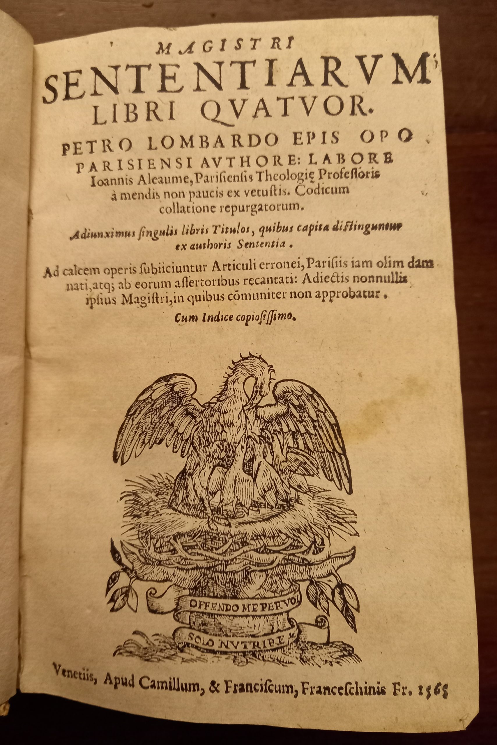 Magistri sententiarum libri quatuor. Petro Lombardo episcopo Parisiensi authore: labore Ioannis Aleaume, Parisiensis theologiæ profesoris a mendis non paucis ex vetustis. Codicum collatione repurgatorum. Adiunximus singulis libris titulos … Ad calcem operis subiiciuntur articuli erronei, Parisiis iam olim damnati, … cum indice copiosissimo