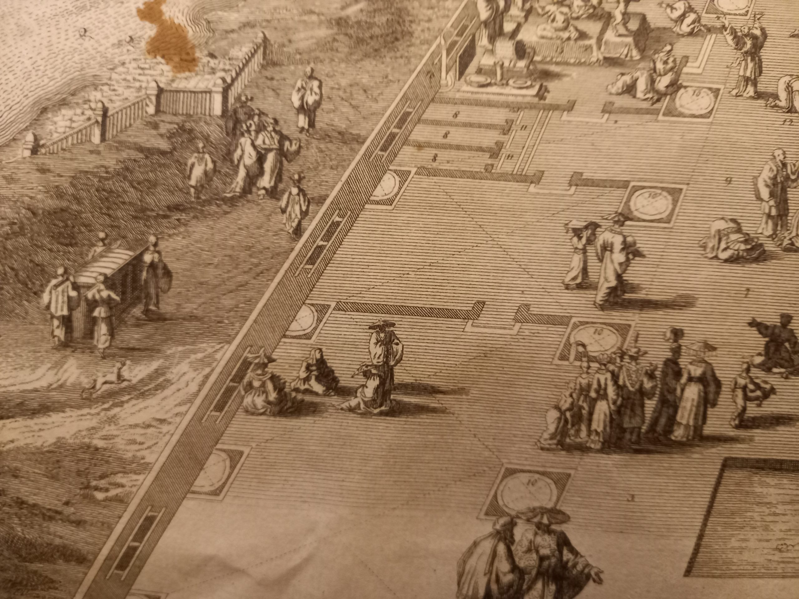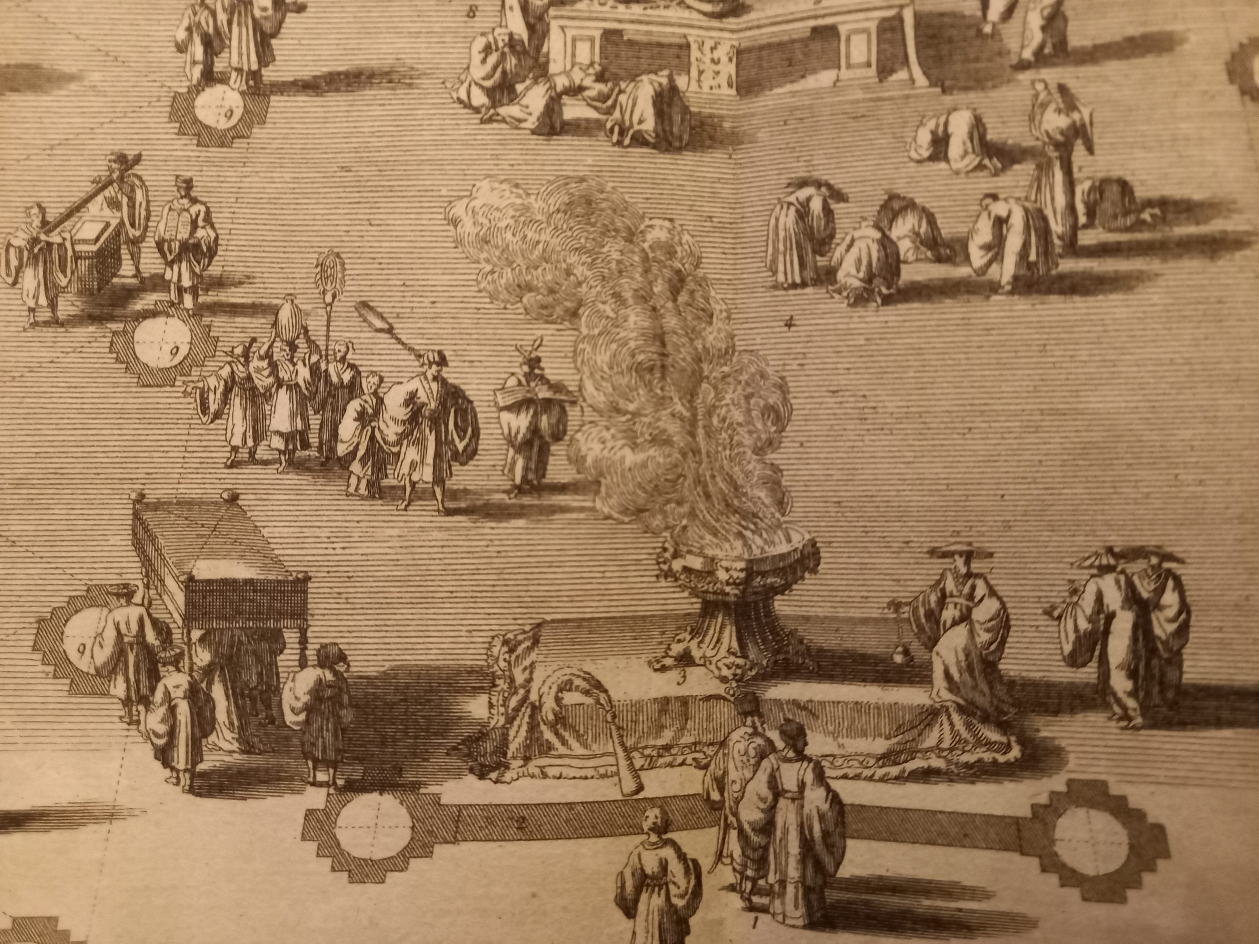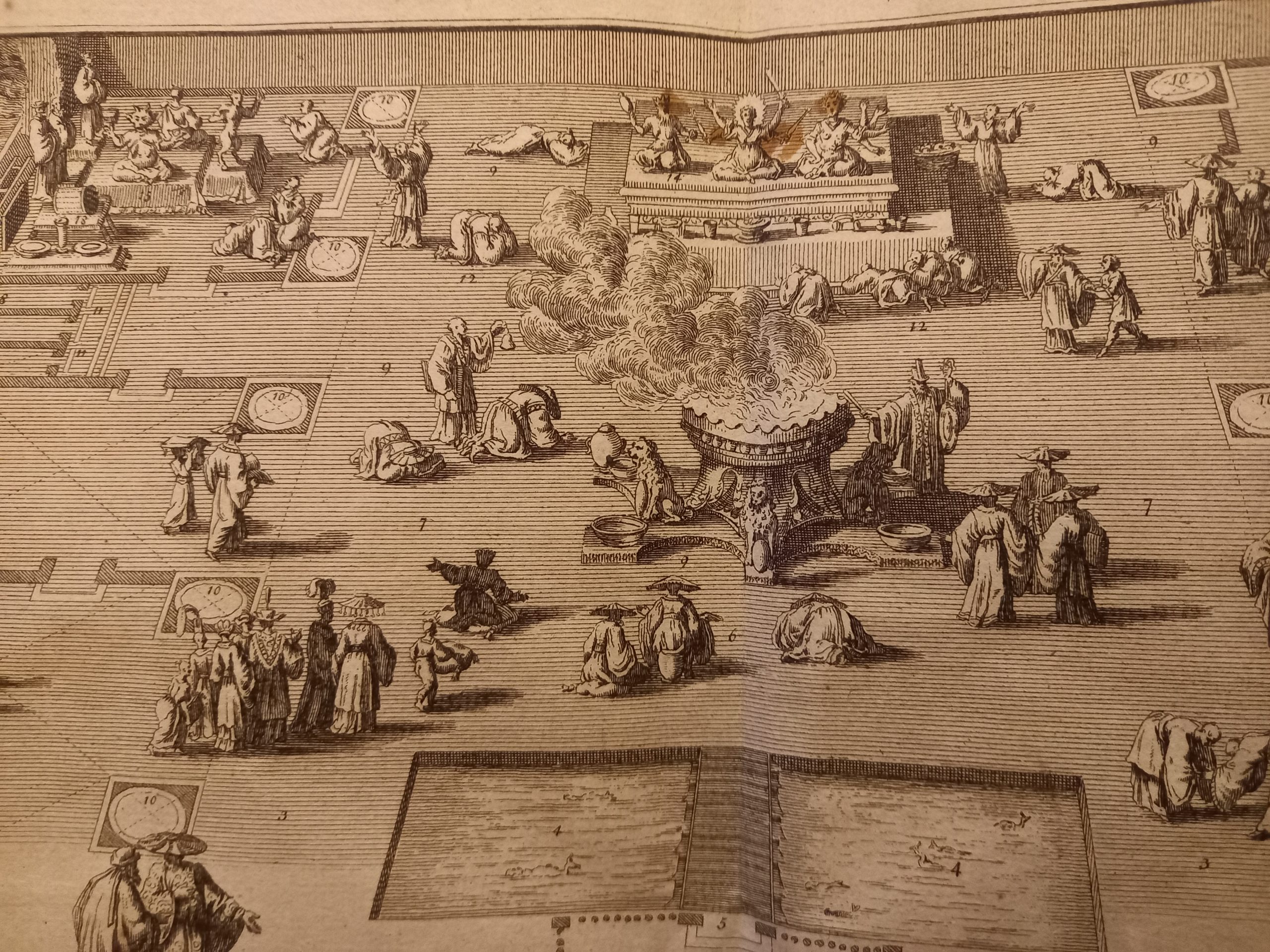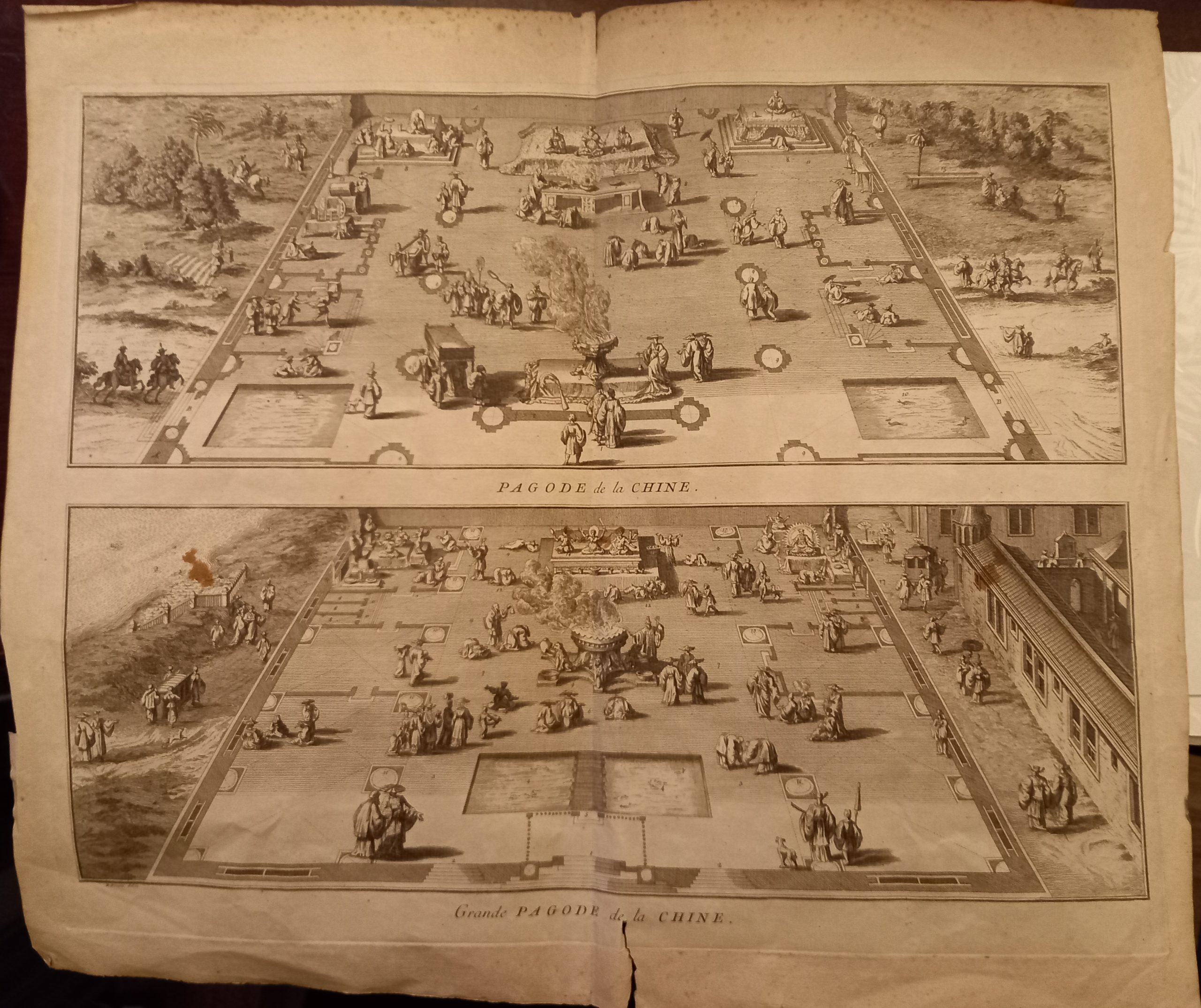 Two scenes on one page showing scenes on the square of a Pagoda, probably in Changzhou. Fine copper engraving by Bernard Picart and taken from Bernard Picart’s famous Céréonies et costumes religieuses de tous les peuples du monde representées par des figures dessinées de la main de Bernard Picard.The book was the most elaborate history of world religion published up to that time.