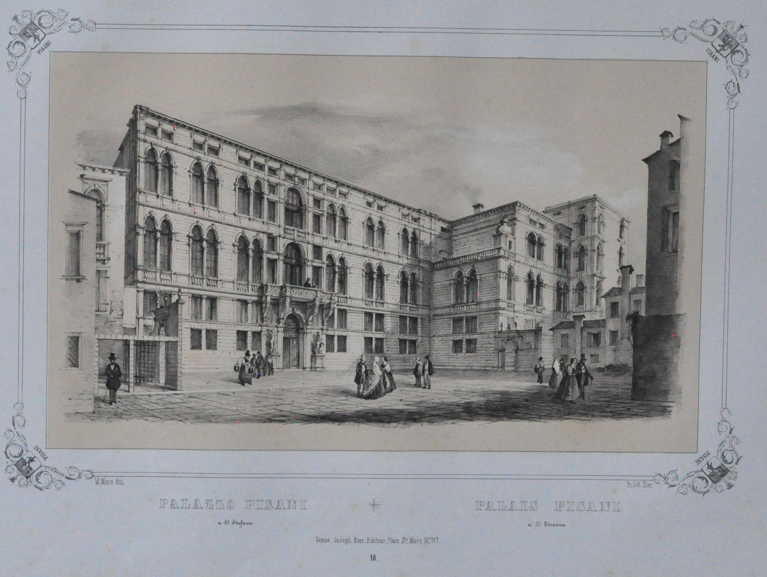 Litografia di 530 x 335 mm su carta di cellulosa. Incisione in cornice con stemmi della famiglia Pisani agli angoli. In basso al centro, in italiano e francese: “Palazzo Pisani a St Stefano – Palais Pisani à St Etienne”. Più sotto “Venise, Joseph Kier Editeur, place S. Marco N° 117” Più sotto: “18”. Proveniente da “Venezia monumentale e pittoresca” di Gianjacopo Fontana. Moro Marco (1817-1885): litografo, disegnatore, editore di stampe. Nato a Zenson di Piave (TV), morto a Venezia. 530 x 335 mm lithograph on cellulose paper. Engraving in the frame with the Pisani family coats of arms at the corners. Bottom center, in Italian and French: “Palazzo Pisani a St Stefano – Palais Pisani à St Etienne”. Below “Venise, Joseph Kier Editeur, place S. Marco N ° 117” Below: “18”. Coming from “Monumental and picturesque Venice” by Gianjacopo Fontana. Moro Marco (1817-1885): lithographer, draftsman, print publisher. Born in Zenson di Piave (TV), died in Venice.