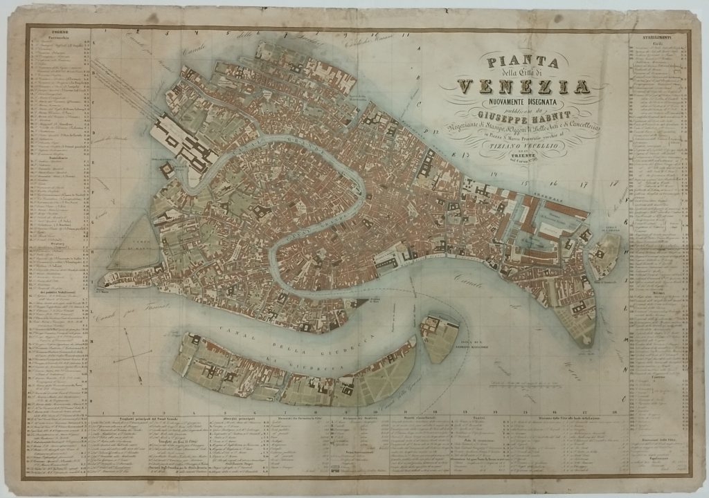 Litografia di mm 570 x 727, in coloratura d’epoca. Piccole piegature, ma buon esemplare. Iscrizioni : in alto a destra “Pianta della Città di Venezia nuovamente disegnata, pubblicata da Giuseppe Habnit Negoziante di Stampe, d’Oggetti di Belle Arti e di Cancelleria in Piazza S. Marco Procuratie Vecchie al Tiziano Vecellio ed in Trieste sul Corso N°702”. In tre riquadri 185 richiami con nomi di località, tra cui molte di interesse turistico. Questa pianta, finemente incisa e ricca di notizie topografiche, rappresenta un accurato piano dell’intera città. L’area della Stazione Ferroviaria è completata in tutte le sue strutture, ma mancano ancora i ponti degli Scalzi e dell’Accademia. Sono ben evidenziate con segni convenzionali le chiese, gli stablimenti pubblici Civili e Militari, i confini delle Parrocchie e dei Sestieri. Il suo archetipo va ricercato nella pianta incisa dallo stesso Garlato ed edita da Paolo Ripamonti Carpano nel 1847. Per la sua qualità informativa il suo esempio sarà seguito da numerosi altri illustratori. (EN) Lithograph measuring 570 x 727 mm, in period colouring. Small creases, but good copy. Inscriptions: top right “Plan of the City of Venice again drawn, published by Giuseppe Habnit Shopkeeper of Prints, Fine Art Objects and Stationery in Piazza S. Marco Procuratie Vecchie at Tiziano Vecellio and in Trieste on Corso N°702 “. In three boxes 185 references with names of places, including many of tourist interest. This plan, finely engraved and full of topographical information, represents an accurate plan of the entire city. The railway station area is completed in all its structures, but the Scalzi and Accademia bridges are still missing. The churches, the Civil and Military public establishments, the boundaries of the Parishes and the Sestieri are well highlighted with conventional signs. His archetype is to be found in the plan engraved by Garlato himself and published by Paolo Ripamonti Carpano in 1847. Due to its informative quality, his example will be followed by numerous other illustrators.