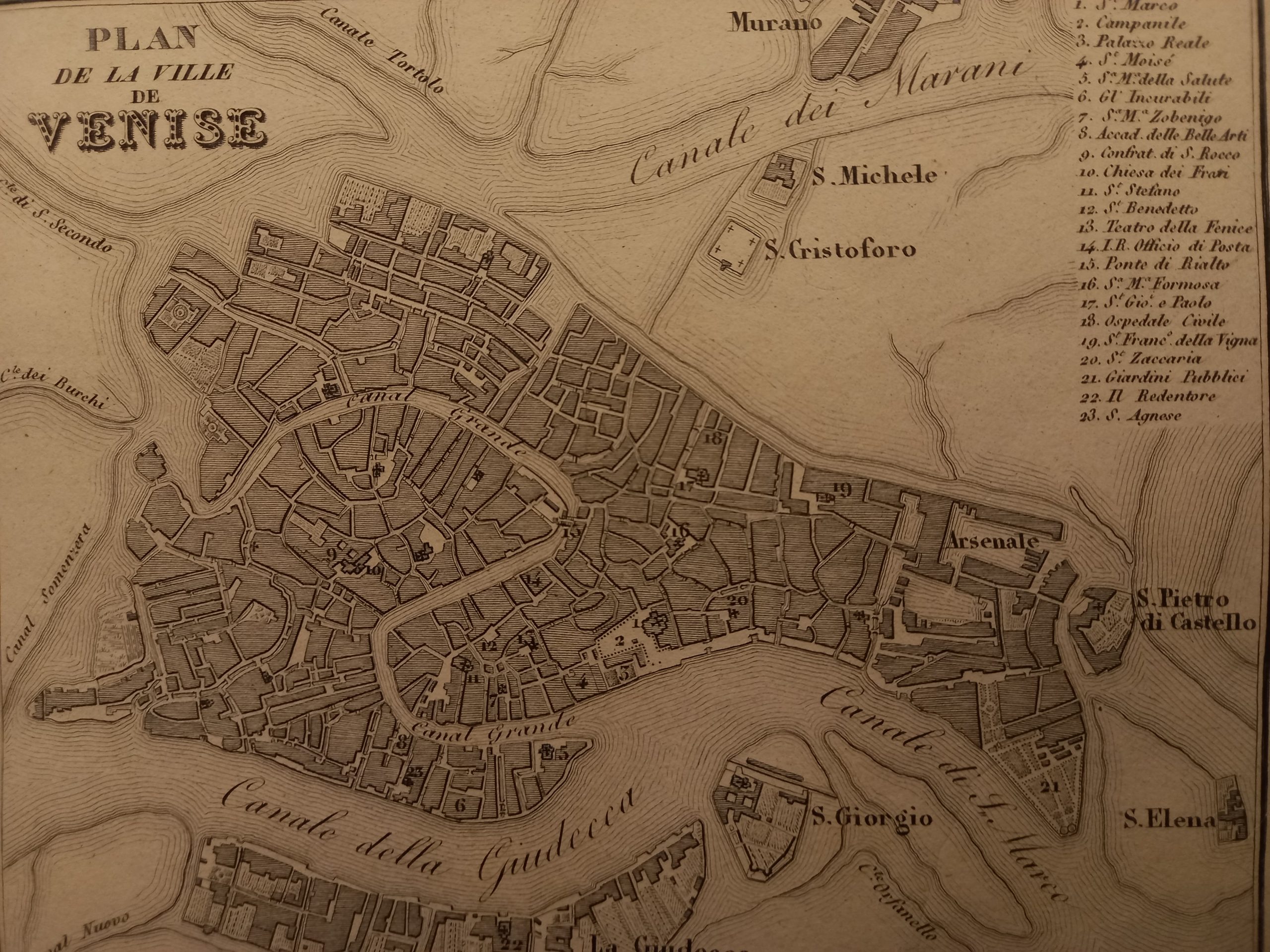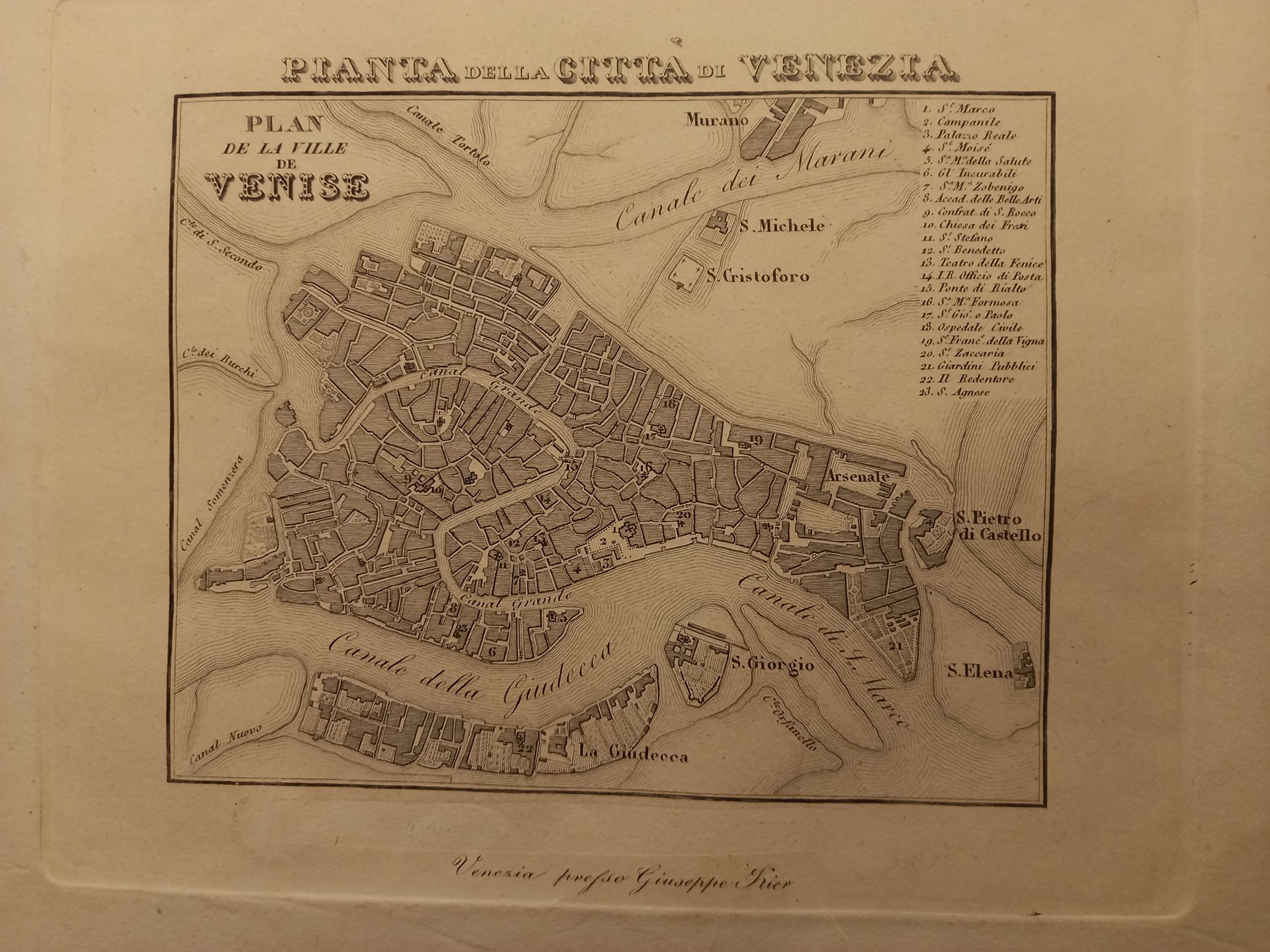 Incisione in acciaio di mm 123 x 155. In alto al centro, Pianta della Città di Venezia, Plan de la Ville de Venise. Ai margini inferiori le note editoriali. Dentro riquadro in alto a destra 23 rimandi, su un’unica colonna. Proveniente da: “Otto giorni a Venezia di Antonio Quadri”
