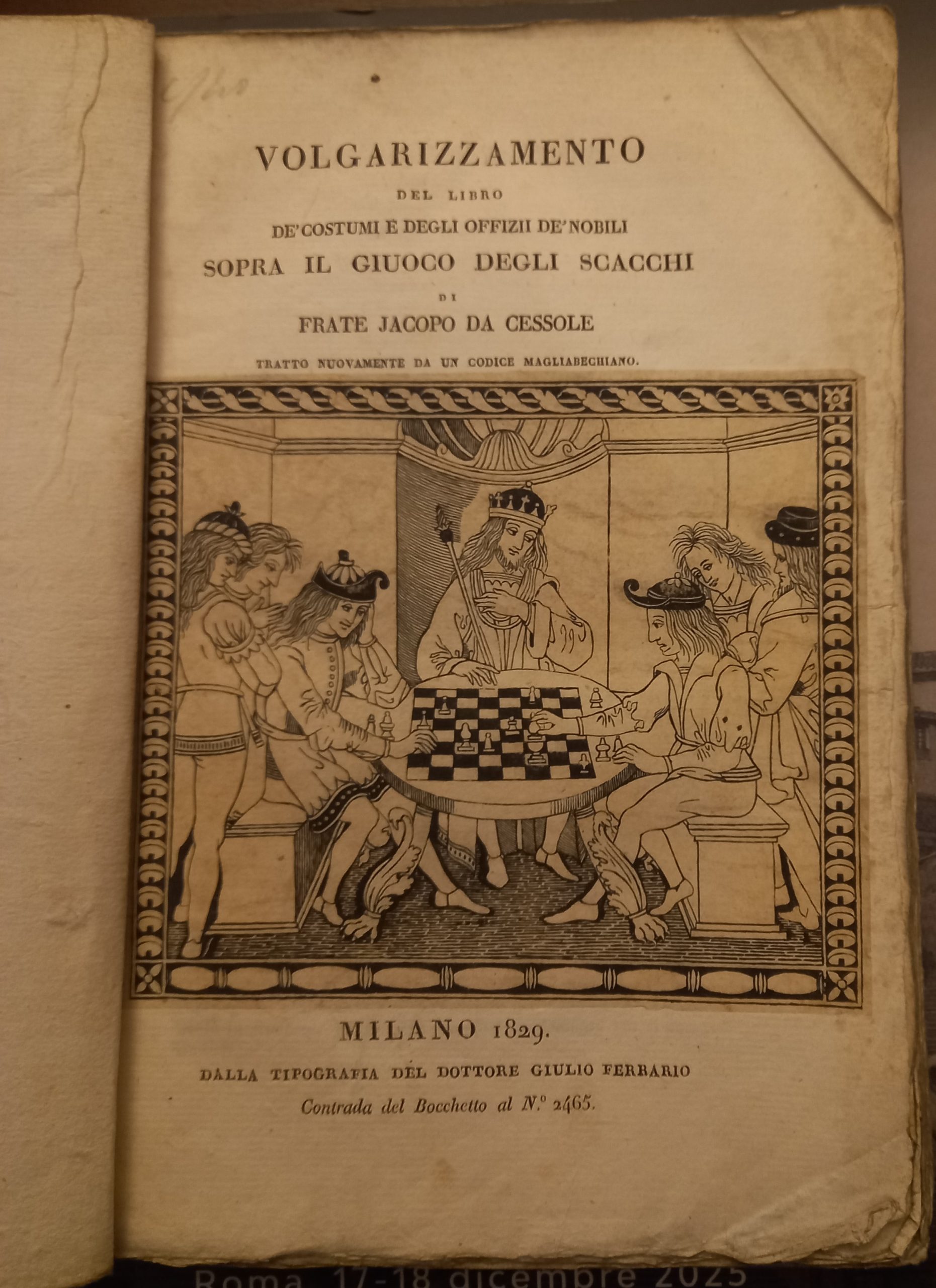 In-8 (22,5 cm) XX 162 (2). Bella xilografia al frontespizio e altre nel testo. Intonso. Brossura editoriale. Terza edizione con testo che segue quello del codice Magliabechiano. Le illustrazioni xilografiche di questa edizione sono tratte dalla prima edizione fiorentina. Con un’ampia xilografia del titolo e 13 xilografie di testo montate. XX, 162 pagine, 1 foglio. Brossura con copertina litografata. Linde N. 4244; van der Linde, Supplementi 123; Chicco-Sanvito, Lineamenti …, 181; Sanvito Bibliografia italiana degli scacchi dalle origini al 2015 N 1544. Esemplare con ampi margini. Un’opera interessante basata sul “Liber de moribus hominum et de officiis nobilium ac popularium super ludo saccorum”, scritto intorno al 1300 dal domenicano longobardo Jacopo da Cessolis su richiesta dei suoi confratelli. Si tratta di un’interpretazione allegorica degli scacchi, derivata dai sermoni, suddivisa in quattro parti principali. In primo luogo, viene descritta l’origine del gioco, poi i pezzi degli scacchi in relazione alle classi nobiliari e ai mestieri e alle professioni come fabbro, muratore, sarto, speziale, notaio, ecc. Infine, vengono discussi gli usi e i doveri. Un indice completo conclude l’edizione. Questo “didattico di proprietà” ha raggiunto un vasto pubblico per molti anni. Le xilografie molto belle e decorative, stampate su carta leggermente colorata, si basano sull’edizione fiorentina degli incunaboli del 1493. A pagina 140 è presente una xilografia con il titolo ripetuto. Copertina anteriore con una macchia marrone. Dorso riparato con una striscia di carta. Un’edizione importante e rara. A cura di Pietro Marocco, cfr. carta *2r, cfr. Zambrini, Le opere volgari a stampa dei secoli XIII e XIV, col. 266 Segnatura: *¹⁰ 1-10⁸ 11². Sul frontespizio e all’interno illustrazioni rimontate. Jacopo da Cessole: domenicano, ‘magister theologiae’ a Reims. Nato nella seconda metà del XIII secolo a Cessole presso Asti e morto dopo il 1322.